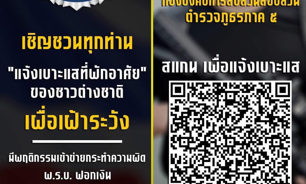 เชิญชวนทุกท่าน “แจ้งเบาะแสที่พักอาศัย” ของชาวต่างชาติเผื่อเฝ้าระวัง