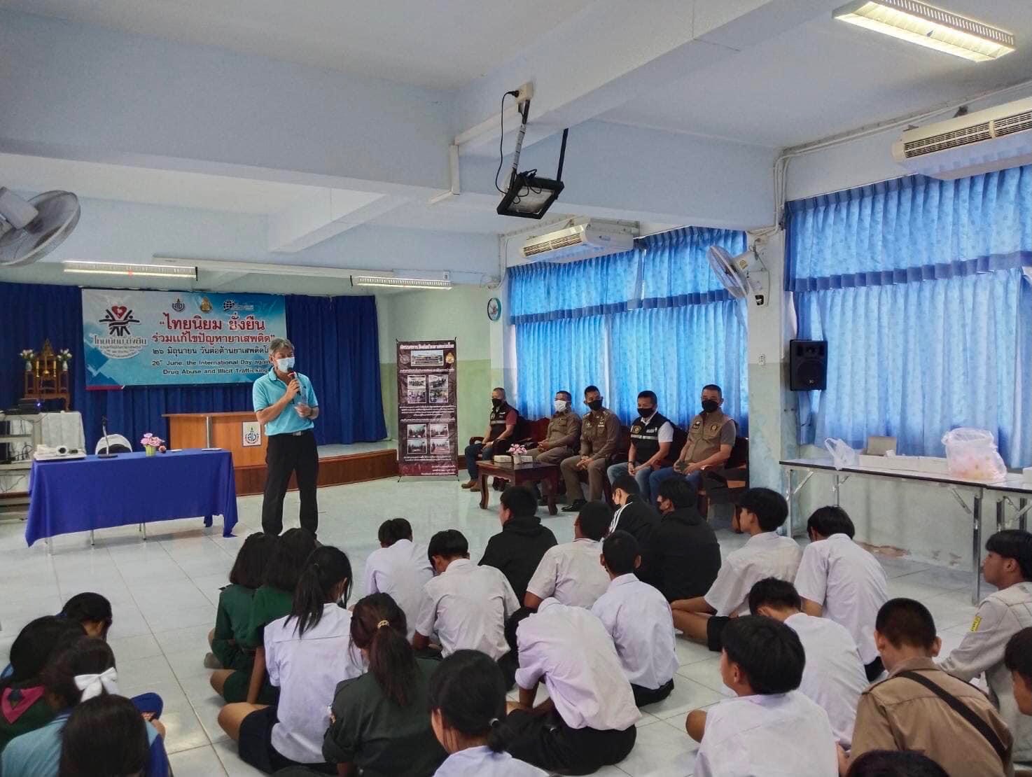 วันนี้ (22 มิ.ย. 2566) เวลา 13.00 น. โดยการอำนวยการของ ว่าที่ พ.ต.อ.ชวลิต จินดารัตน์ ผกก.สภ.บ้านเสด็จ, พ.ต.ท.พงษ์ศิลป์ ธนะภาษี รอง ผกก.ป.สภ.บ้านเสด็จ มอบหมายให้ พ.ต.ท.โสกิจ วรวงศ์ สวป.สภ.บ้านเสด็จ, พ.ต.ท.ธรรม์ธรรศ ตาจุมปา สว.สส.สภ.บ้านเสด็จ พร้อมด้วยข้าราชการตำรวจชุดสืบสวน และชุดงานป้องกันปราบปราม สภ.บ้านเสด็จ ได้เข้าร่วมเป็นผู้ตรวจสารเสพติดในปัสสาวะ สำหรับนักเรียนกลุ่มเสี่ยง ในการดำเนินตามโครงการสถานศึกษาสีขาวปลอดยาเสพติดและอบายมุข ซึ่งจัดขึ้นโดยโรงเรียนเสด็จวนชยางค์กูลวิทยา ณ หอประชุมบูรณาการ ICT โรงเรียนเสด็จวนชยางค์กูลวิทยา ต.บ้านเสด็จ อ.เมือง จ.ลำปาง