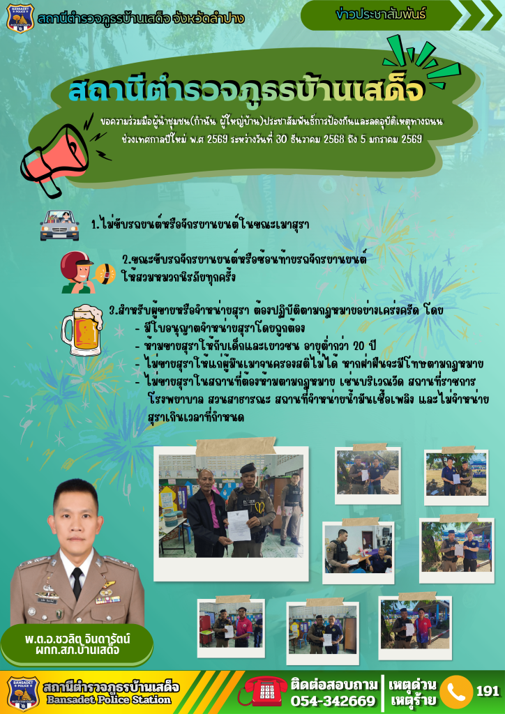 สั่งการให้ ว่าที่ พ.ต.ต.นพ พึ่งศรี สวป.ฯ , ด.ต.ชาติ บุญสมปาน ผบ.หมู่ (ป.)ฯ รักษาการร้อยเวร 20 พร้อมสายตรวจ 201 ว.4 ขอความร่วมมือส่งหนังสือเรื่อง ประชาสัมพันธ์ป้องกันอุบัติเหตุช่วงเทศกาลปีใหม่ 2569 โดยได้ส่งมอบให้ตัวแทนทั้ง 3 ตำบล นำหนังสือไปแจกให้ผู้ใหญ่บ้านทั้ง 38 หมู่บ้าน เรียบร้อยแล้ว