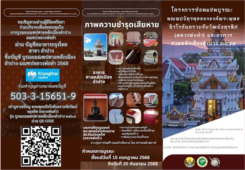 มีความประสงค์จะซ่อมแซมมณฑปจัตุรมุขขององค์พระพุทธนิรโรคันตรายชัยวัฒน์จตุรทิศ (หลวงพ่อดำ) และมณฑปศาลหลักเมืองจังหวัดลำปาง