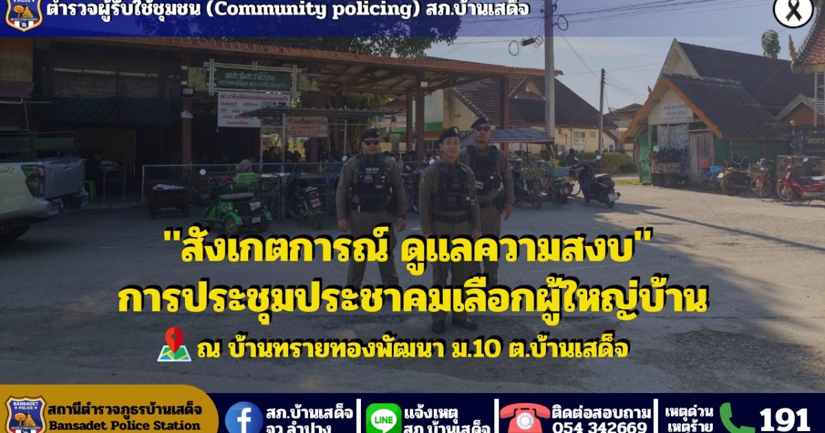 วันนี้ 24 พฤศจิกายน 2568 ตั้งแต่เวลา 09.00 น.ภายใต้การอำนวยการของ พ.ต.อ.ชวลิต จินดารัตน์ ผกก.สภ.บ้านเสด็จ , พ.ต.ท.พงษ์ศิลป์ ธนะภาษี รอง ผกก.ป.ฯ, พ.ต.ท.กำจร ใจจันทร์ สวป.ฯ สั่งการให้ ร.ต.อ.พิชิตชัย ไชยาโส รอง สวป. สภ.บ้านเสด็จ ร้อยเวร 20 พร้อมด้วยสายตรวจ 201 ว.4 ภารกิจสังเกตการณ์ ดูเเลความสงบ การประชุมประชาคมเลือกผู้ใหญ่บ้าน (ณ บ้านทรายทองพัฒนา ม.10 ต.บ้านเสด็จ) เหตุการณ์ทั่วไปปกติ