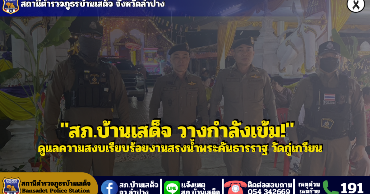 วันที่ 1 เมษายน 2569 เวลา 20.00 น. โดยการสั่งการของ พ.ต.อ.ชวลิต จินดารัตน์ ผกก.สภ.บ้านเสด็จ , พ.ต.ท.พงษ์ศิลป์ ธนะภาษี รอง ผกก.ป.ฯ สั่งการให้ พ.ต.ต.นพ พึ่งศรี สวป.ฯ , ร.ต.อ.มณัส เอกรัตน์ รอง สว.(ป.)ฯ ร้อยเวร 20 พร้อมสายตรวจ 201 ว.4 ดูแลรักษาความสงบงานประเพณีสรงน้ำพระพุทธรูปพระคันธารราฐ (พระขอฝน) สรงน้ำพระธาตุเจดีย์ ( ณ วัดกู่เกวียน ) บ.ทรายทอง ม.3 ต.บ้านเสด็จ อ.เมือง จ.ลำปาง
