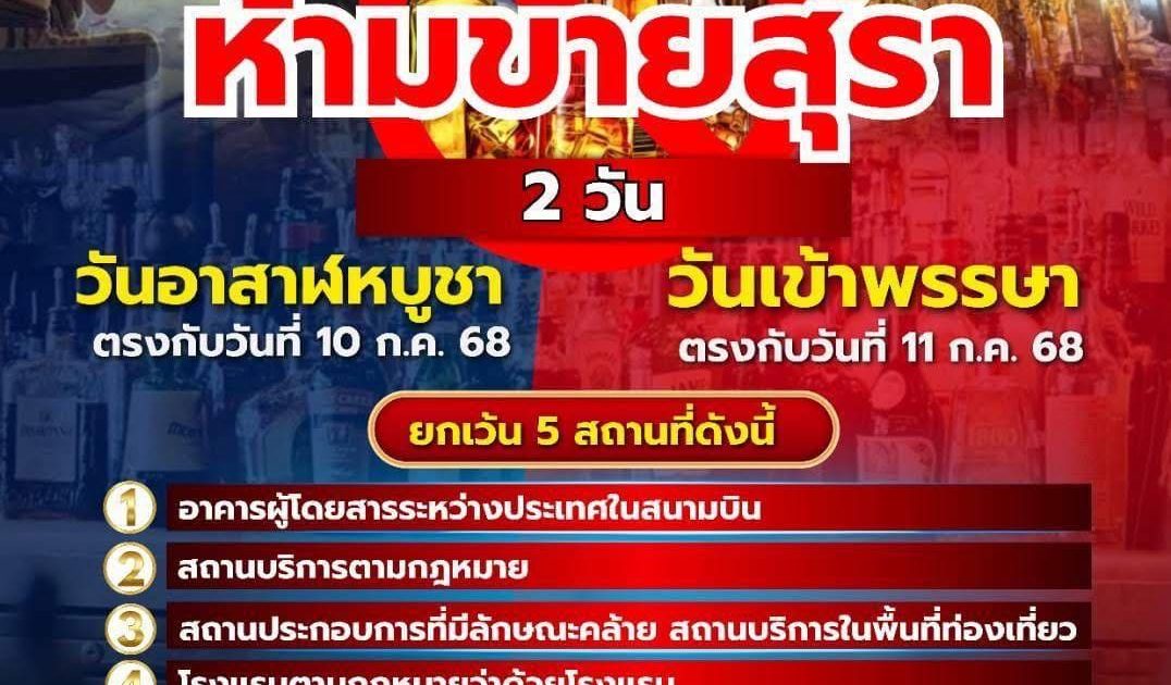 เนื่องในวันอาสาฬหบูชา และวันเข้าพรรษา วันที่ 10 -11 กรกฎาคม 2568 งดจำหน่าย “เครื่องดื่มแอลกอฮอล์ทุกชนิด” ทั่วประเทศ ตามกฎหมายควบคุมการจำหน่ายเครื่องดื่มแอลกอฮอล์ในวันสำคัญทางศาสนา หากฝ่าฝืนมีโทษ จำคุกไม่เกิน 6 เดือน หรือปรับไม่เกิน 10,000 บาท หรือทั้งจำทั้งปรับ
