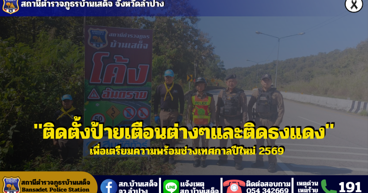 วันที่ 26 ธ.ค. 2568 เวลา 11.00 น. นำโดย พ.ต.อ.ชวลิต จินดารัตน์ ผกก.สภ.บ้านเสด็จ ,ร.ต.ท.วิรัช วงค์บุตร รอง สว.(ป.) สภ.บ้านเสด็จ ร้อยเวร 20 สายตรวจ 201 จนท.ธุรการ ป.ฯ เเละชุดจิตอาสา สภ.บ้านเสด็จ ร่วม ว.4 ติดตั้งป้ายเตือนต่างๆและติดธงแดง เพื่อเตรียมความพร้อมช่วงเทศกาลปีใหม่ 2569