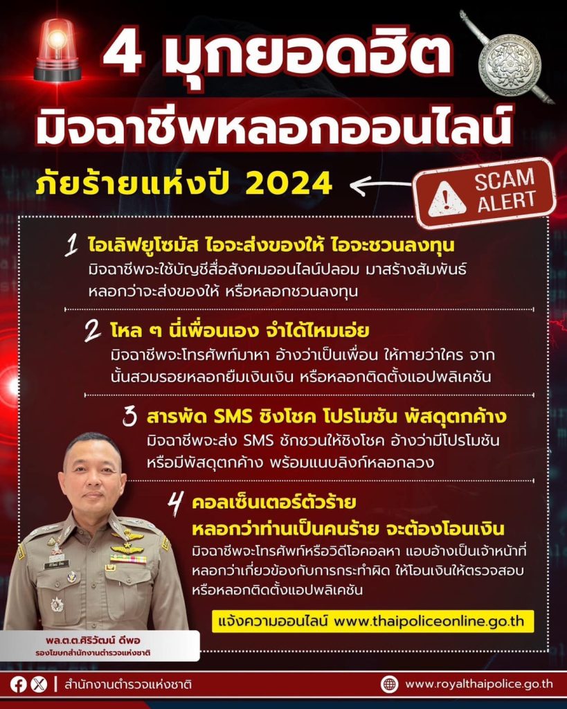สำนักงานตำรวจแห่งชาติ จึงขอตีแผ่ 4 มุกยอดฮิต มิจฉาชีพออนไลน์ ภัยร้ายแห่งปี 2024 เพื่อให้พี่น้องประชาชนรู้เท่าทันกลลวงของมิจฉาชีพ ดังนี้