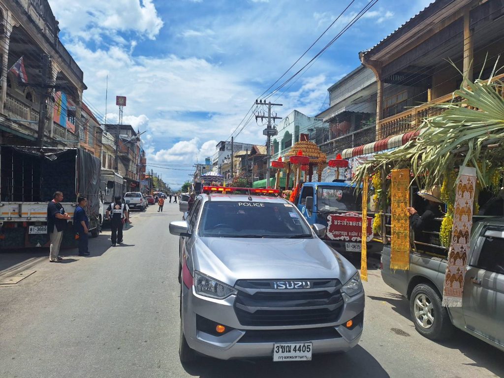 วันนี้ 13 เมษายน 2568 เวลา 12.00 น. โดยการอำนวยการของ พ.ต.อ.ชวลิต จินดารัตน์ ผกก.สภ.บ้านเสด็จ ,พ.ต.ท. พงษ์ศิลป์ ธนะภาษี รอง ผกก.ป.ฯ พ.ต.ท.กำจร ใจจันทร์ สวป.ฯ สั่งการให้ ส.ต.ต.ประสามิตร งามสม , ส.ต.ต.ยอดภู กันทะจักร์ ว.4 นําขบวนแห่พระเจ้าทองทิพย์องค์อินทร์ วัดทรายมูล และพระฝนแสนห่า วัดพระธาตุเสด็จ ของตำบลบ้านเสด็จ ไปยังงานประเพณีประจําปีสลุงหลวง กล่องใหญ่ปี๋ใหม่เมือง นครลําปาง ประจําปี ๒๕๖๘