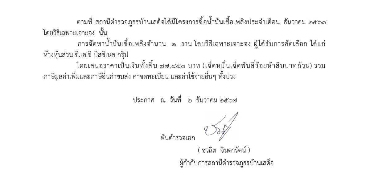 ประกาศเกี่ยวกับการจัดซื้อจัดจ้างน้ำมันเชื้อเพลิง ประจำเดือน ธันวาคม 2567