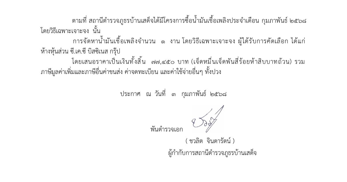 ประกาศเกี่ยวกับการจัดซื้อจัดจ้างน้ำมันเชื้อเพลิง ประจำเดือน กุมภาพันธ์ 2568