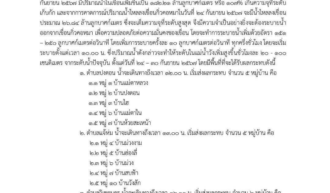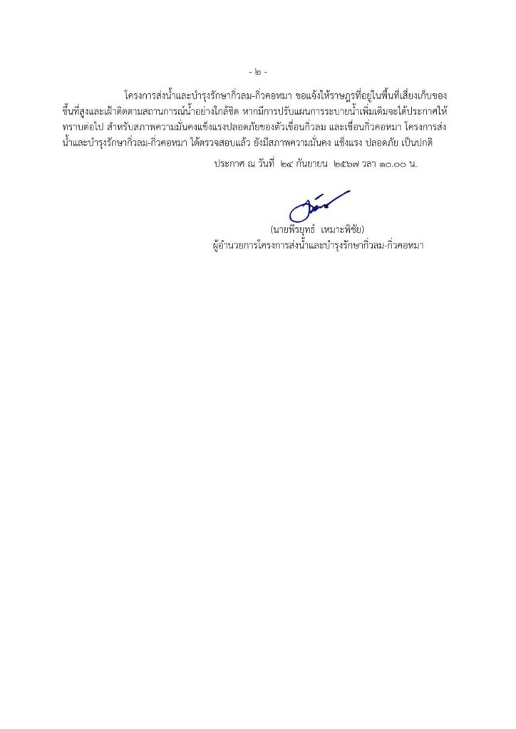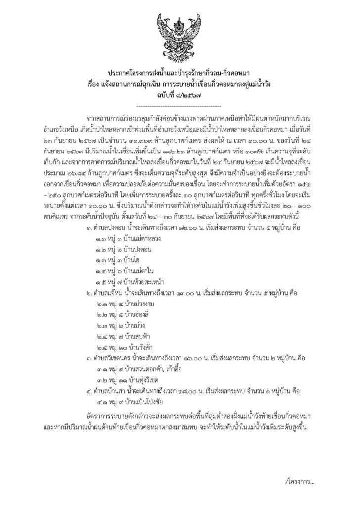 เรื่อง เเจ้งสถานการณ์ฉุกเฉิน การระบายน้ำเขื่อนกิ่วคอหมาลงสู่เเมาน้ำวัง ฉบับที่ 9/2567