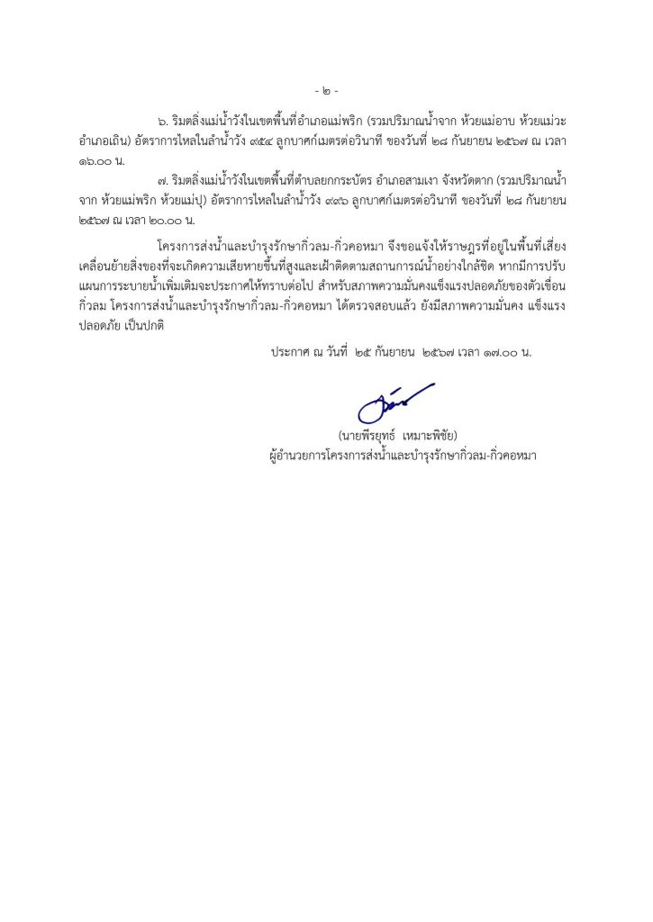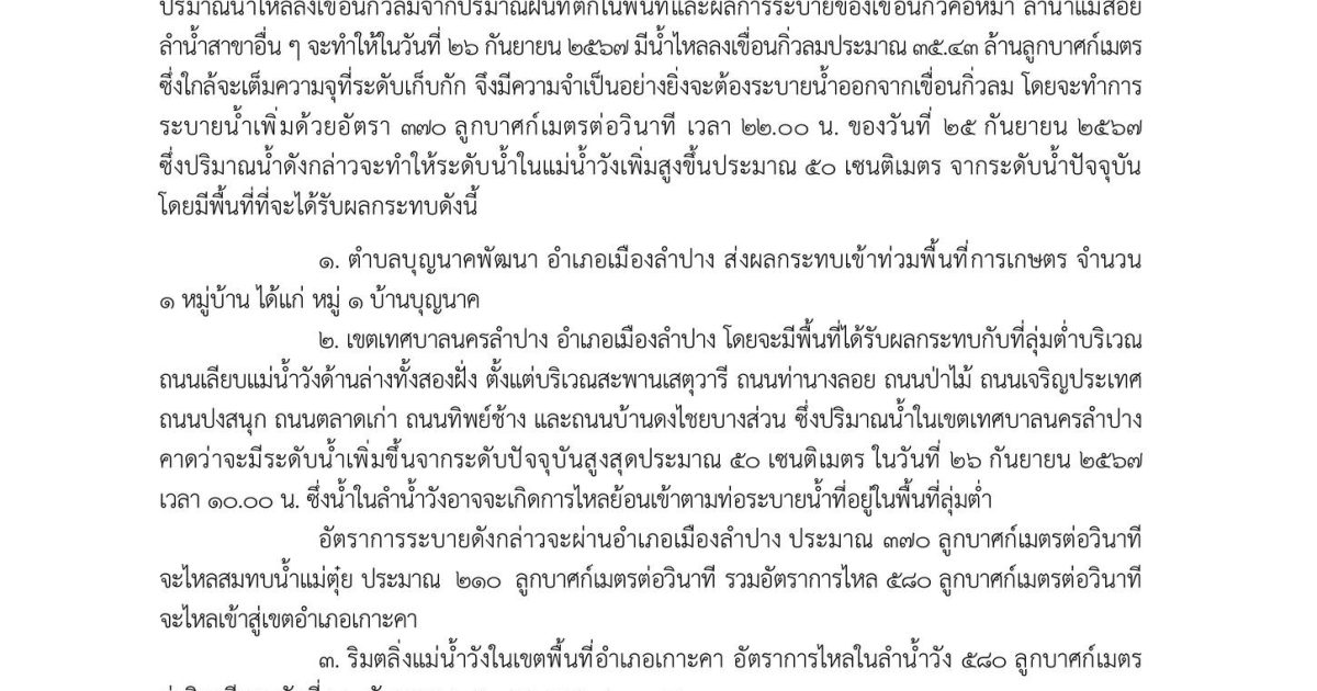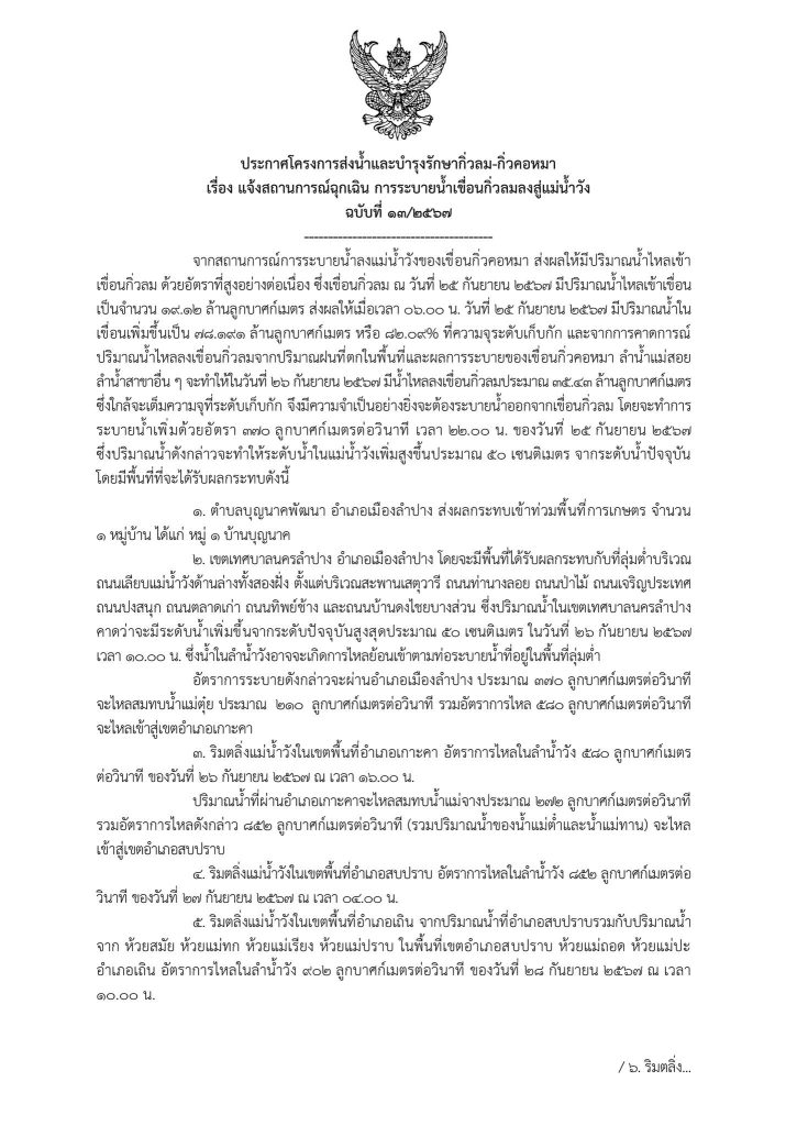 ประกาศโครงการส่งน้ำและบำรุงรักษากิ่วลม-กิ่วคอหมา เรื่อง แจ้งสถานการณ์ฉุกเฉิน การระบายน้ำเขื่อนกิ่วลมลงสู่แม่น้ำวัง ฉบับที่ 13/2567 25 September 2567 by admin_pimpisa / ข่าวประชาสัมพันธ์ ประกาศโครงการส่งน้ำและบำรุงรักษากิ่วลม-กิ่วคอหมา เรื่อง แจ้งสถานการณ์ฉุกเฉิน การระบายน้ำเขื่อนกิ่วลมลงสู่แม่น้ำวัง ฉบับที่ 13/2567