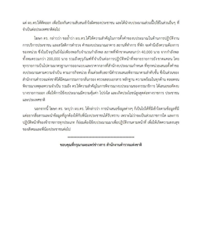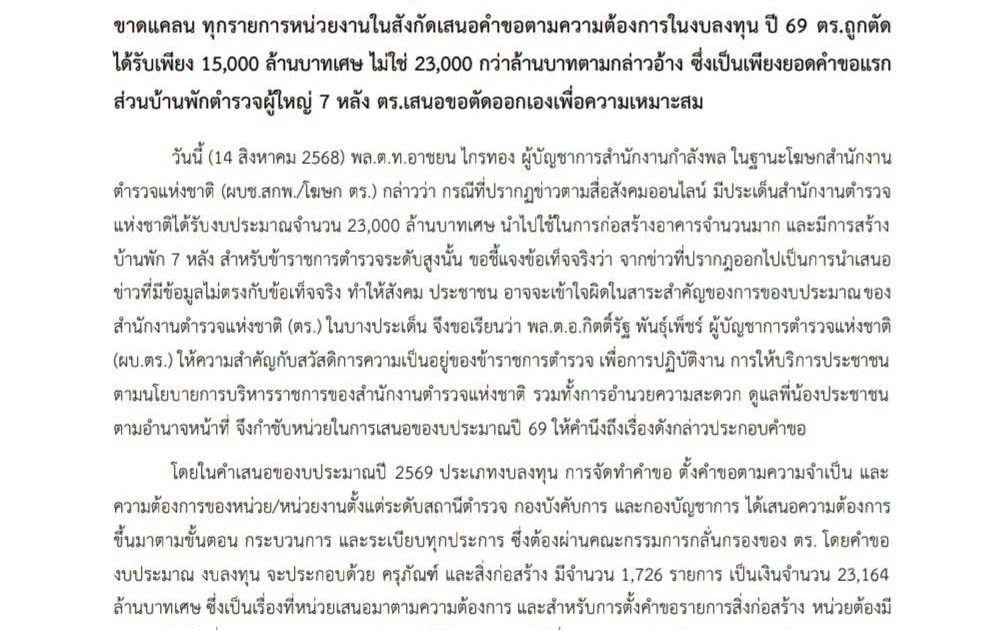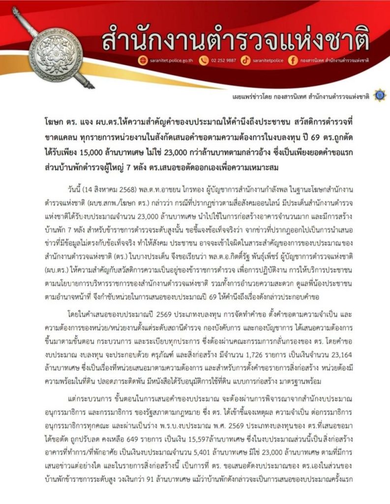 ประกาศ โฆษก ตร. แจง ผบ.ตร.ให้ความสำคัญคำของบประมาณให้คำนึงถึงประชาชน สวัสดิการตำรวจที่ ขาดแคลน ทุกรายการหน่วยงานในสังกัดเสนอคำขอตามความต้องการในงบลงทุน ปี 69 ตร.ถูกตัด ได้รับเพียง 15,000 ล้านบาทเศษ ไม่ใช่ 23,000 กว่าล้านบาทตามกล่าวอ้าง ซึ่งเป็นเพียงยอดคำขอแรก ส่วนบ้านพักตำรวจผู้ใหญ่ 7 หลัง ตร.เสนอขอขอตัดออกเองเพื่อความเหมาะสม