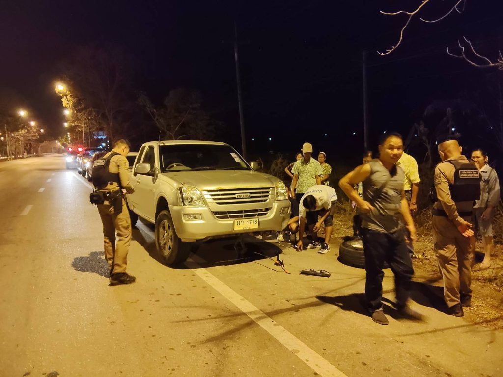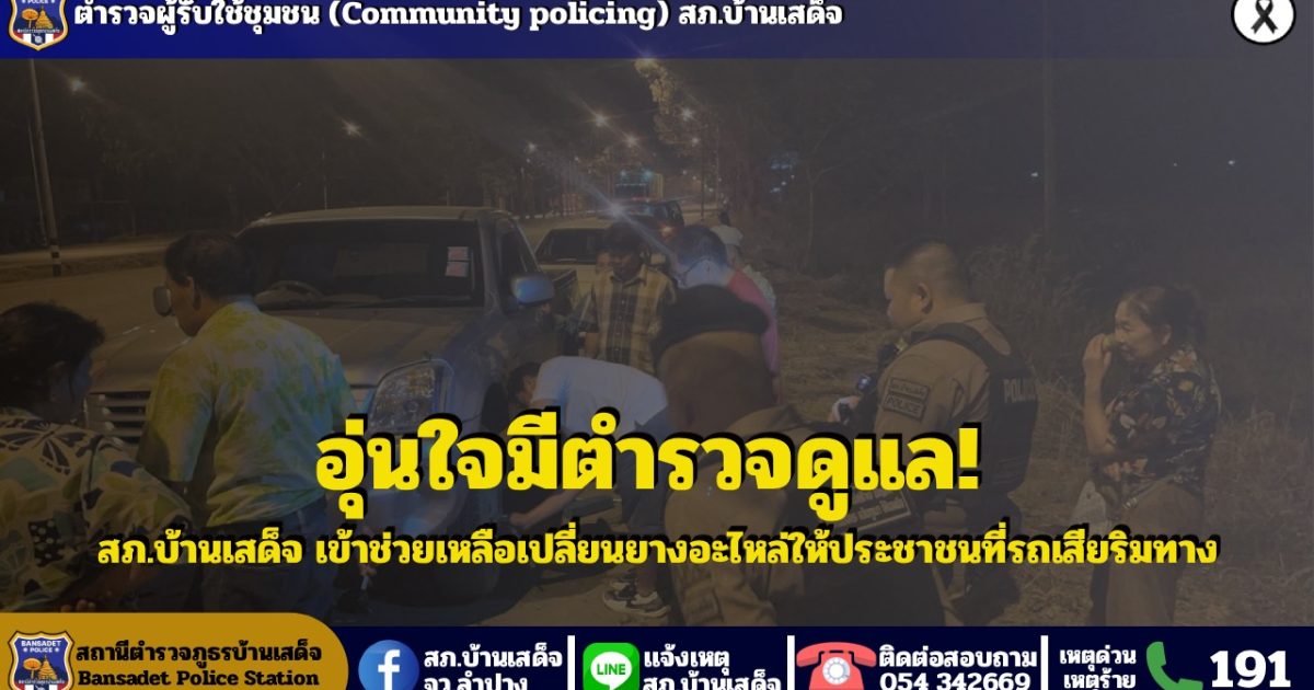 วันที่ 18 กุมภาพันธ์ 2569 เวลา 19.10 น.ได้รับแจ้งทางศูนย์วิทยุสภ.บ้านเสด็จ ว่ามีประชาชนขอความช่วยเหลือรถยนต์ยางแตก ที่ถนนสายลำปาง – งาว เขตพื้นที่บ้านทรายทอง ม.3 ต.บ้านเสด็จ อ.เมืองลำปาง จ.ลำปาง ด.ต.ชาติ บุญสมปาน ผบ.หมู่ (ป.)ฯ รักษาการร้อยเวร 20 พร้อมสายตรวจ 201 ว.4 ที่เกิดเหตุ ได้ช่วยเหลือประชาชนเปลี่ยนยางอะไหล่เป็นที่เรียบร้อย