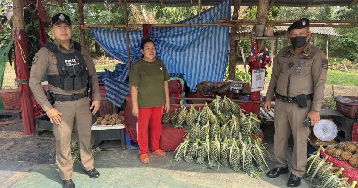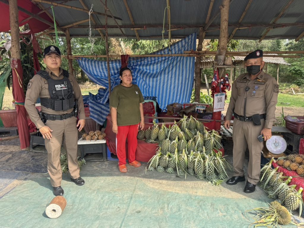 วันที่ 18 พฤษภาคม 2567 เวลา 09.30 น. ร้อยเวร 20 พร้อมสายตรวจ 201 ว.4 ประชาสัมพันธ์การป้องกันเหตุลักทรัพย์(ในฤดูกาลสับปะรด) เพื่อป้องกันเหตุลักทรัพย์ในพื้นที่รับผิดชอบ ที่ร้านสับปะรด