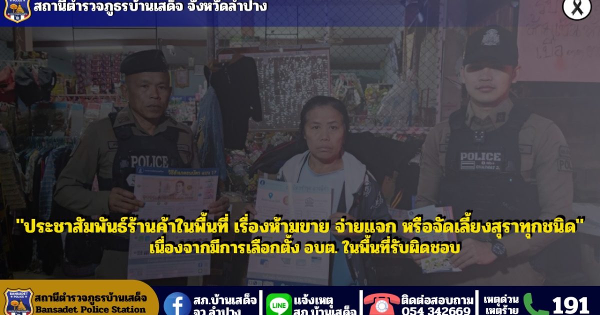 วันที่ 10 มกราคม 2569 เวลา 18.05 น. โดยการอำนวยการของ พ.ต.อ.ชวลิต จินดารัตน์ ผกก.สภ.บ้านเสด็จ , พ.ต.ท.พงษ์ศิลป์ ธนะภาษี รอง ผกก.ป.ฯ , ว่าที่ พ.ต.ต.นพ พึ่งศรี สวป.ฯ สั่งการให้ ด.ต.ชาติ บุญสมปาน ผบ.หมู่ (ป.)ฯ รักษาการร้อยเวร 20 พร้อมสายตรวจ 201 ว.4 ประชาสัมพันธ์ร้านค้าในพื้นที่ เรื่องห้ามขาย จ่ายแจก หรือจัดเลี้ยงสุราทุกชนิด ตั้งแต่เวลา 18.00 น. ของวันที่ 10 ม.ค.69 จนถึงเวลา 18.00 น. ของวันที่ 11 ม.ค.69 เนื่องจากมีการเลือกตั้ง อบต. ในพื้นที่รับผิดชอบ