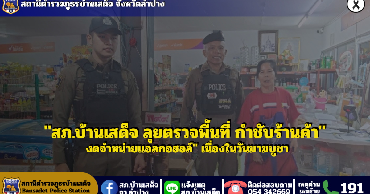 วันที่ 2 มีนาคม 2569 เวลา 19.00 น. โดยการสั่งการของ พ.ต.อ.ชวลิต จินดารัตน์ผกก.สภ.บ้านเสด็จ , พ.ต.ท.พงษ์ศิลป์ ธนะภาษี รอง ผกก.ป.ฯ , พ.ต.ต.นพ พึ่งศรี สวป.ฯ สั่งการให้ ด.ต.ชาติ บุญสมปาน ผบ.หมู่ (ป.)ฯ รักษาการร้อยเวร 20 พร้อมสายตรวจ 201 ว.4 ประชาสัมพันธ์ งดจำหน่ายเครื่องดื่มแอลกอฮอล์ ร้านค้าในพื้นที่รับผิดชอบ ตั้งแต่เวลา 00.01 – 24.00 น. ของวันที่ 3 มีนาคม 2569 เนื่องในวันมาฆบูชา