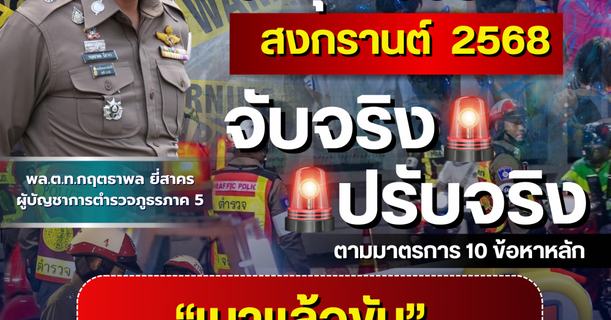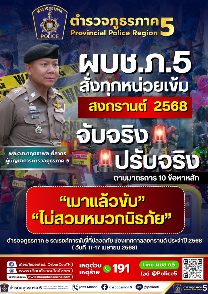 ดูแลอำนวยความสะดวกด้านการจราจรให้กับประชาชน เดินทางด้วยความปลอดภัย พร้อมบังคับใช้กฎหมายจราจร 10 ข้อหาหลักอย่างเข้มงวด โดยเน้นหนักในขับรถในขณะเมาสุรา ขับรถเร็วเกินที่กฎหมายกำหนด ไม่สวมหมวกนิรภัย โดยให้ดำเนินการจับจริง ปรับจริง และกวดขันจับกุมอาชญากรรม อาวุธปืน ยาเสพติด และสิ่งผิดกฎหมายต่างๆ เพื่อให้เกิดความปลอดภัยแก่ประชาชน และประชาสัมพันธ์ให้ประชาชนที่ไม่ได้อยู่บ้าน เข้าร่วม “โครงการร่วมใจ ยกระดับความปลอดภัยบ้านประชาชนช่วงเทศกาลสำคัญ (ฝากบ้าน 4.0)” เพื่อให้เจ้าหน้าที่ได้เข้าไปช่วยสอดส่องดูแลความปลอดภัยในทรัพย์สินในช่วงเทศกาลสงกรานต์ประจำปี 2568 ทั้งนี้ให้เจ้าหน้าที่ตำรวจทุกหน่วยในสังกัดพร้อมปฏิบัติหน้าที่อย่างเต็มที่ เพื่อดูแลความปลอดภัยในชีวิตและทรัพย์สิน อำนวยความสะดวกให้กับพี่น้องประชาชน ขอให้ประชาชนมั่นใจ เดินทางกลับภูมิลำเนาและท่องเที่ยวอย่างมีความสุขในช่วงเทศกาลสงกรานต์ หากพบเห็นหรือมีเบาะแสเกี่ยวกับการกระทำความผิด หรือสิ่งของผิดกฎหมายในพื้นที่ หรือในโซเชียลมีเดีย โปรดแจ้งสายด่วน 191 หรือ line@police5 ได้ตลอดเวลา 24 ชั่วโมง