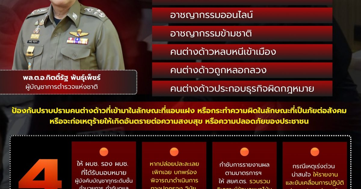 ตามที่ รัฐบาล และสำนักงานตำรวจแห่งชาติ ( ตร. ) มีนโยบายเร่งด่วน ในการแก้ไขปัญหายาเสพติด อาชญากรรมออนไลน์ อาชญากรรมข้ามชาติ คนต่างด้าวหลบหนีเข้าเมืองโดยผิดกฎหมาย และคนต่างด้าวถูกหลอกลวงหรือประกอบธุรกิจผิดกฎหมาย ตลอดจนการป้องกันปราบปรามคนต่างด้าวที่เข้ามาในลักษณะที่แอบแฝงหรือกระทำความผิดในลักษณะที่เป็นภัยต่อสังคม หรือจะก่อเหตุร้ายให้เกิดอันตรายต่อความสงบสุขหรือความปลอดภัยของประชาชน หรือความมั่นคงแห่งราชอาณาจักร อันส่งผลต่อภาพลักษณ์หรือประสิทธิภาพในการบังคับใช้กฎหมายของสังคมโดยรวม