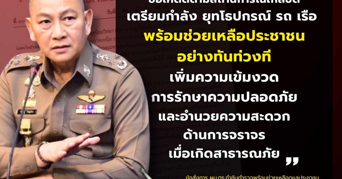 ผบ.ตร.กำชับให้ติดตามสถานการณ์ใกล้ชิด เตรียมกำลัง ยุทโธปกรณ์ ยานพาหนะ รถ เรือ พร้อมช่วยเหลือประชาชน อย่างทันท่วงที เพิ่มความเข้มงวดในการรักษาความปลอดภัย และอำนวยความสะดวกด้านการจราจรเมื่อเกิดสาธารณภัย โดยกำชับให้ดูแลตำรวจและครอบครัวที่ได้รับผลกระทบด้วย