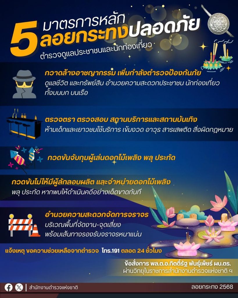 พล.ต.ท.ชัยต์พจน สูวรรณรักษ์ ผู้บัญชาการสำนักงานกำลังพล/รองโฆษกสำนักงานตำรวจแห่งชาติ กล่าวว่า ในวันพุธที่ 5 พฤศจิกายน 2568 นี้ เป็นวันลอยกระทง ถือเป็นประเพณีสำคัญของคนไทย เป็นการอนุรักษ์ ส่งเสริมประเพณีวัฒนธรรม และวิถีชีวิตของชุมชนที่เกี่ยวข้องกับสายน้ำให้คงอยู่ ซึ่งในปีนี้พื้นที่ต่าง ๆ ทั่วประเทศ ยังคงจัดงานประเพณีลอยกระทง โดยปรับรูปแบบการจัดกิจกรรมให้เหมาะสมเพื่อแสดงความสำนึกในพระมหากรุณาธิคุณของสมเด็จพระนางเจ้าสิริกิติ์ พระบรมราชินีนาถ พระบรมราชชนนีพันปีหลวง โดยคาดการณ์ว่าจะมีประชาชนและนักท่องเที่ยวร่วมงานประเพณีวันลอยกระทงในสถานที่ต่าง ๆ เป็นจำนวนมาก ซึ่งอาจทำให้เกิดอาชญากรรม ปัญหาการจราจรติดขัด ปัญหาความเดือดร้อนรำคาญ และอันตรายต่างๆ รวมถึงอาจมีมิจฉาชีพแอบแฝงเข้าไปประทุษร้ายต่อทรัพย์สินในสถานที่จัดงาน