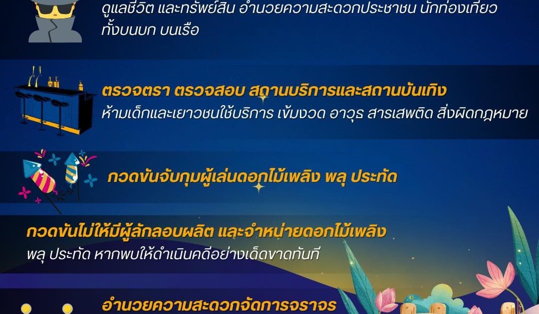 นอกจากนี้ ให้กวดขันจับกุมผู้เล่นดอกไม้เพลิง พลุ ประทัด ในลักษณะที่ก่อให้เกิดความเดือดร้อนรำคาญ หรือเป็นอันตรายต่อชีวิตและทรัพย์สินของประชาชน, กวดขันไม่ให้มีผู้ลักลอบผลิต และจำหน่ายดอกไม้เพลิง พลุ ประทัด หากพบให้ดำเนินคดีอย่างเด็ดขาดทันที เพื่อป้องกันเหตุร้าย และจัดเจ้าหน้าที่ตำรวจปฏิบัติหน้าที่อำนวยความสะดวกและจัดการจราจรเป็นประจำ ในบริเวณสถานที่ที่คาดว่าจะมีผู้ร่วมงานเป็นจำนวนมาก และเส้นทางที่คาดว่าจะมีปัญหาจราจร พร้อมจัดเส้นทางรองรับการจราจรที่หนาแน่น