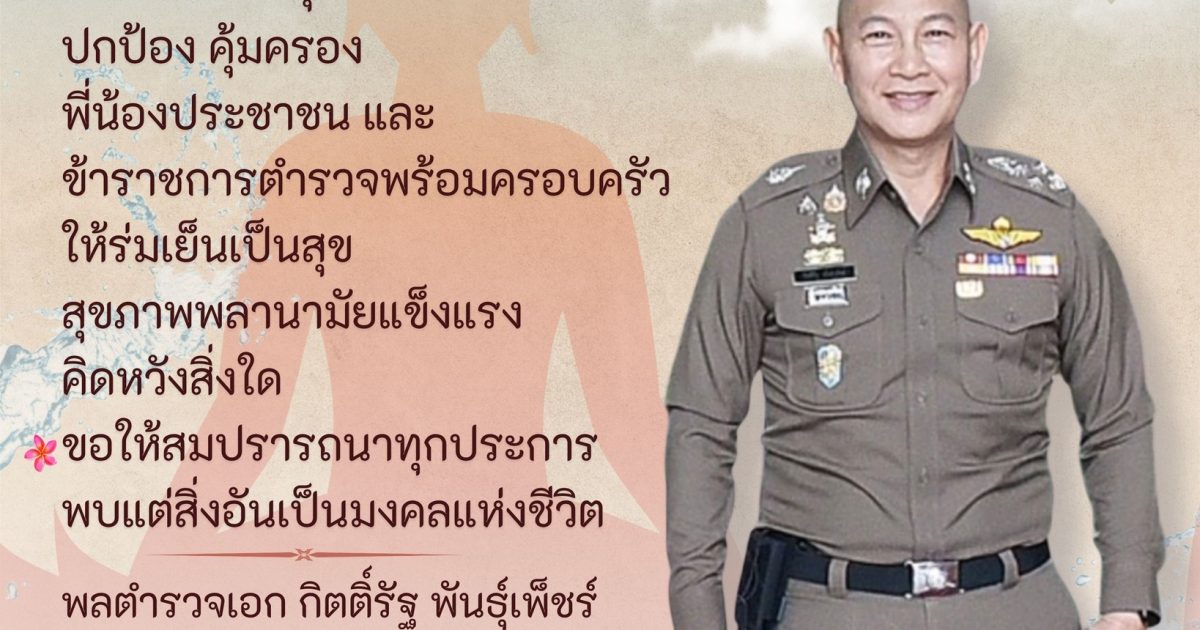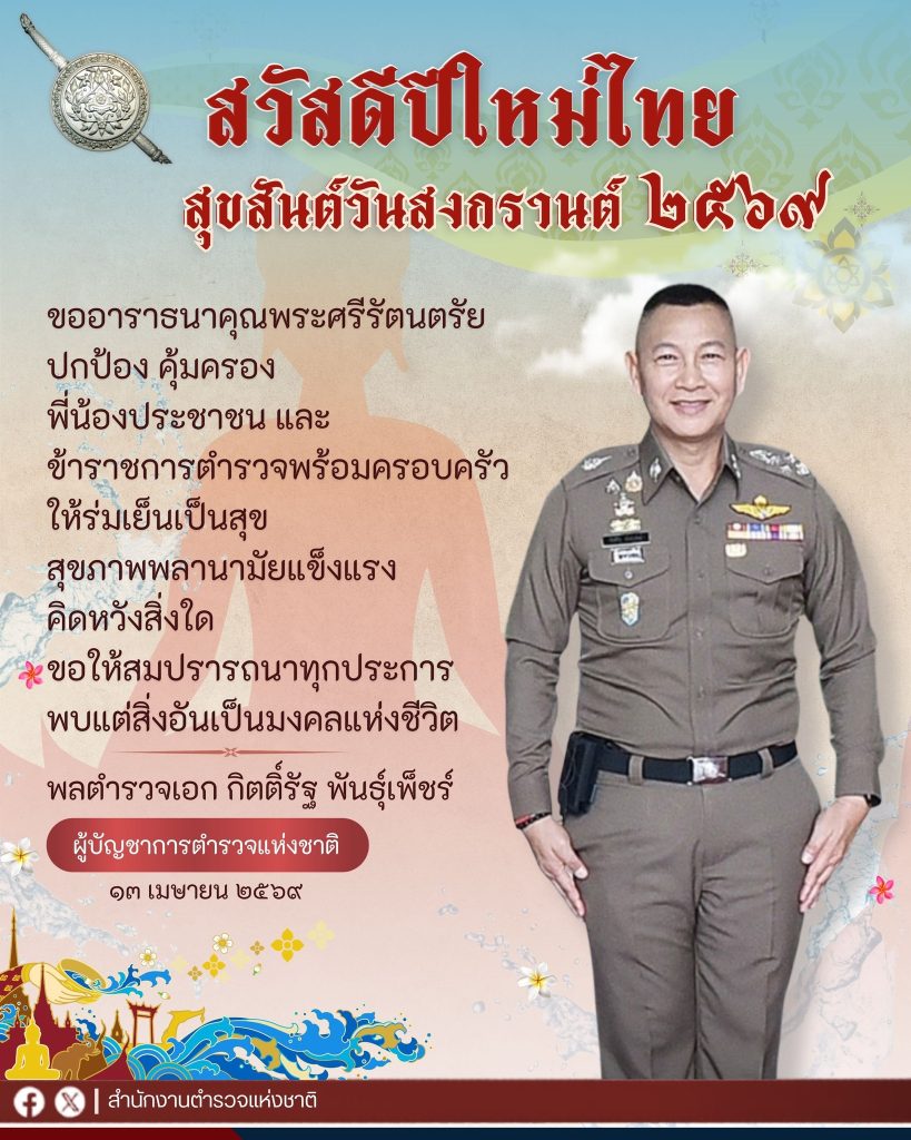พล.ต.อ.กิตติ์รัฐ พันธุ์เพ็ชร์ ผู้บัญชาการตำรวจแห่งชาติ (ผบ.ตร.) ส่งคำอวยพรวันสงกรานต์ 13 เมษายน 2569 แก่ประชาชน ข้าราชการตำรวจ และครอบครัว