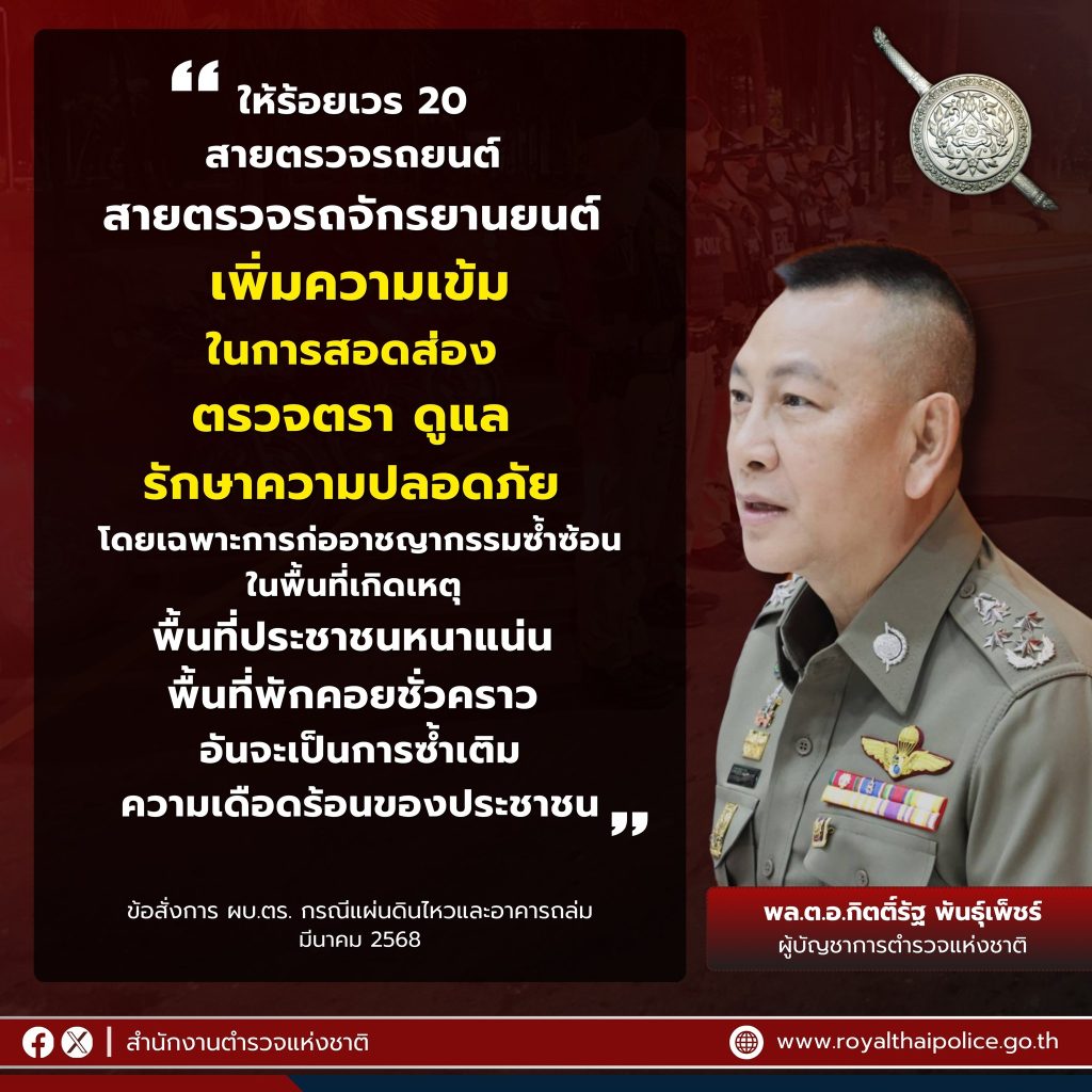 พล.ต.อ.กิตติ์รัฐ พันธุ์เพ็ชร์ ผู้บัญชาการตำรวจแห่งชาติ สั่งการกรณีแผ่นดินไหวและอาคารถล่ม กำชับดูแลประชาชนทุกมิติ