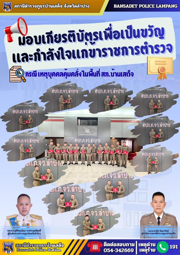 เมื่อวันที่ 9 ธันวาคม 2568 พลตำรวจตรี ภูมิปัญญ์ญา นวตระกูลพิสุทธิ์ ผู้บังคับการตำรวจภูธรจังหวัดลำปาง มอบเกียรติบัตรเพื่อเป็นขวัญและกำลังใจแก่ข้าราชการตำรวจ สภ.บ้านเสด็จ กรณี เหตุบุคคลคุ้มคลั่งในพื้นที่ สภ.บ้านเสด็จ