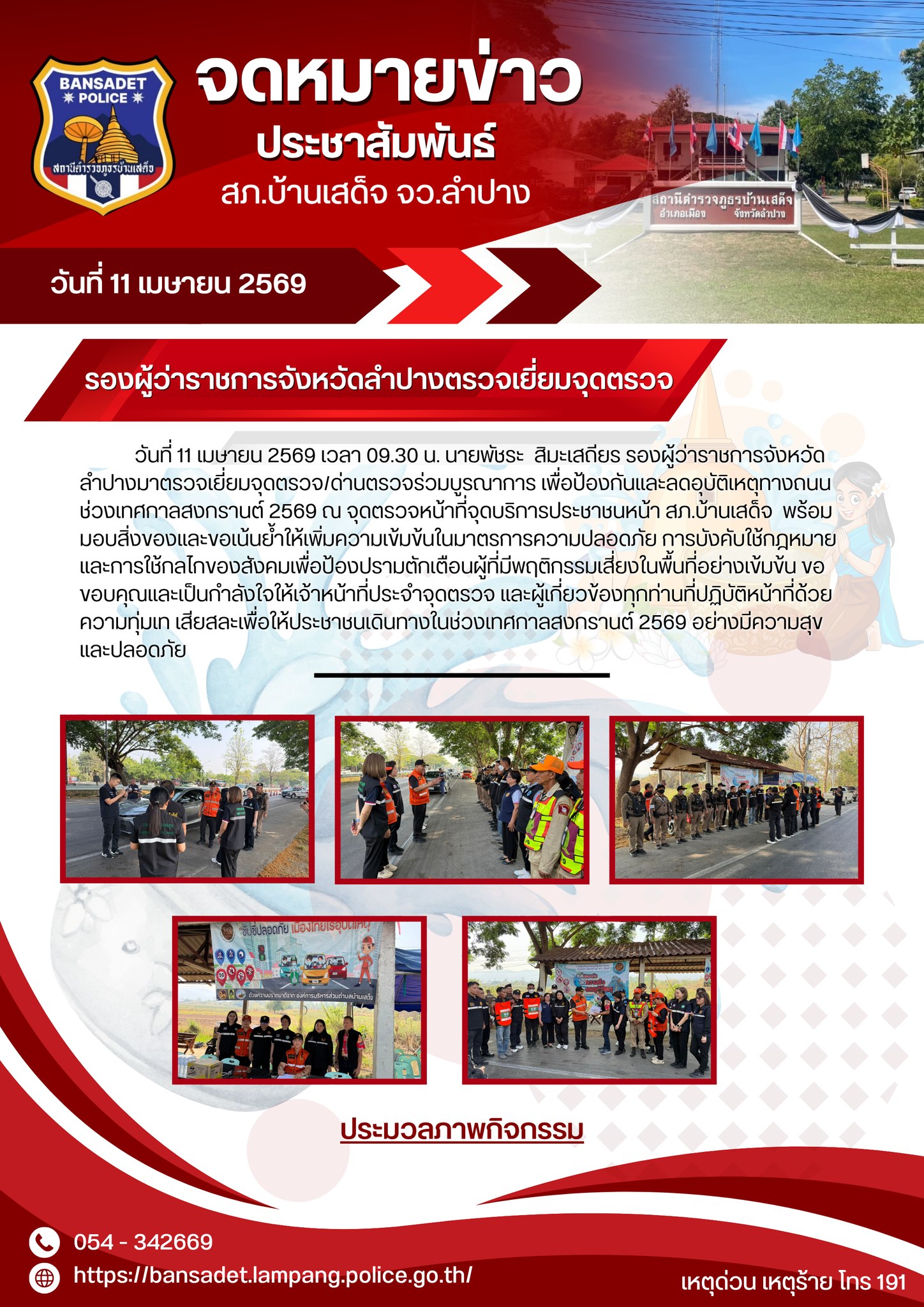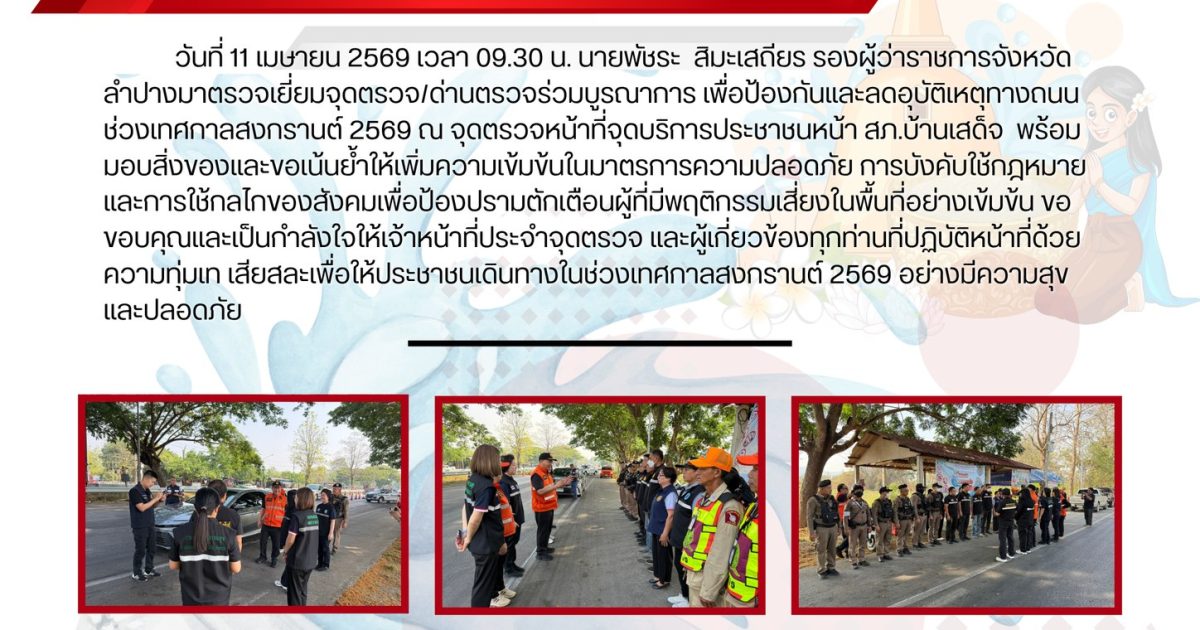 วันที่ 11 เม.ย.69 เวลา 09.30 น. นายพัชระ สิมะเสถียร รองผู้ว่าราชการจังหวัดลำปางมาตรวจเยี่ยมจุดตรวจ/ด่านตรวจร่วมบูรณาการ เพื่อป้องกันและลดอุบัติเหตุทางถนนช่วงเทศกาลสงกรานต์ 2569 ณ จุดตรวจหน้าที่จุดบริการประชาชนหน้า สภ.บ้านเสด็จ โดยมี ร.ต.ท.วิรัช วงค์บุตร รอง สว.(ป.)สภ.บ้านเสด็จ พร้อมด้วยข้าราชการตำรวจ สภ.บ้านเสด็จ เจ้าหน้าที่สาธารณสุข ,เจ้าหน้าที่ฝ่ายปกครอง ,เจ้าหน้าที่ ปภ., กรมประชาสัมพันธ์, มูลนิธิเมาไม่ขับ ร่วมให้การต้อนรับ ท่านได้มอบสิ่งของและขอเน้นย้ำให้เพิ่มความเข้มข้นในมาตรการความปลอดภัย การบังคับใช้กฎหมายและการใช้กลไกของสังคมเพื่อป้องปรามตักเตือนผู้ที่มีพฤติกรรมเสี่ยงในพื้นที่อย่างเข้มข้น ขอขอบคุณและเป็นกำลังใจให้เจ้าหน้าที่ประจำจุดตรวจ และผู้เกี่ยวข้องทุกท่านที่ปฏิบัติหน้าที่ด้วยความทุ่มเท เสียสละเพื่อให้ประชาชนเดินทางในช่วงเทศกาลสงกรานต์ 2569 อย่างมีความสุขและปลอดภัย