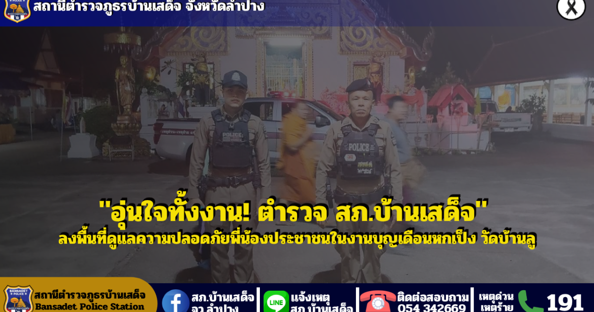 วันนี้ 2 มีนาคม 2569 เวลา 20.00 น.โดยการสั่งการของ พ.ต.อ.ชวลิต จินดารัตน์ผกก.สภ.บ้านเสด็จ , พ.ต.ท.พงษ์ศิลป์ ธนะภาษี รอง ผกก.ป.ฯ , พ.ต.ต.นพ พึ่งศรี สวป.ฯ สั่งการให้ ด.ต.ชาติ บุญสมปาน ผบ.หมู่ (ป.)ฯ รักษาการร้อยเวร 20 พร้อมสายตรวจ 201 ว.4 ดูแลรักษาความปลอดภัย งานประเพณีบุญเดือนหกเป็ง ณ วัดบ้านลู ม.9 ต.บ้านเสด็จ อ.เมืองลำปาง