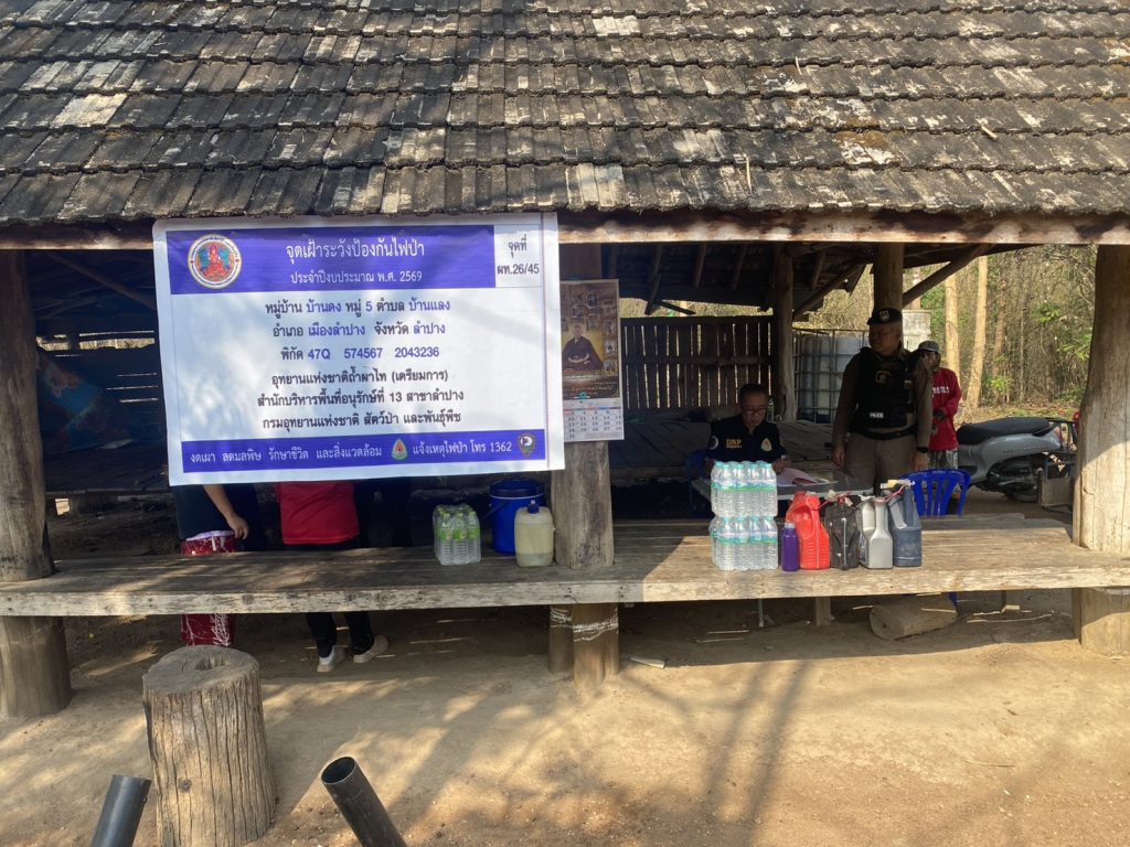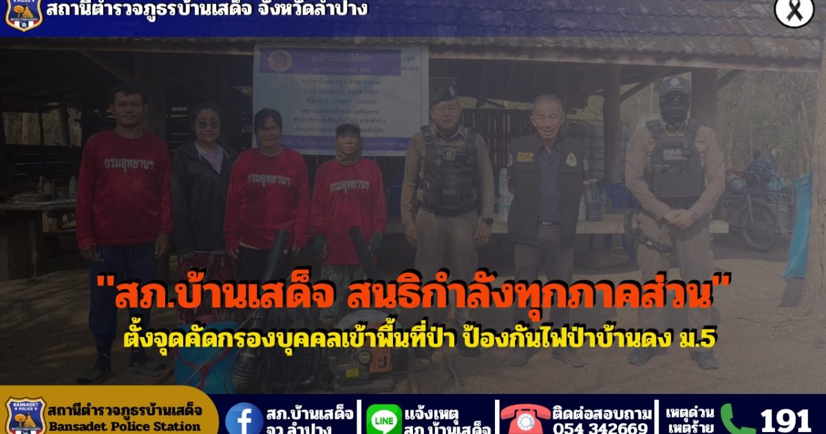 วันที่ 12 มีนาคม 2569 เวลา 09.15 น. ภายใต้การอำนวยการของ พ.ต.อ.ชวลิต จินดารัตน์ ผกก.สภ.บ้านเสด็จ , พ.ต.ท.พงษ์ศิลป์ ธนะภาษี รอง ผกก.ป.ฯ, ว่าที่ พ.ต.ต.นพ พึ่งศรี สวป.ฯ สั่งการให้ ร.ต.ท.วิรัช วงค์บุตร รอง สว.(ป.) สภ.บ้านเสด็จ ร้อยเวร 20ฯ พร้อมด้วยสายตรวจ 201 , กรมอุทยาน , ผู้ใหญ่บ้าน ม.5 ต.บ้านแลงฯ, เจ้าหน้าที่เฝ้าระวังไฟป่า ว.4 ร่วมตั้งจุดคัดกรองบุคคลเข้าใช้พื้นที่ป่า และออกตรวจจุดเฝ้าระวังป้องกันไฟป่า หมู่ 5 บ้านดง ต.บ้านแลง อ.เมืองลำปาง จ.ลำปาง