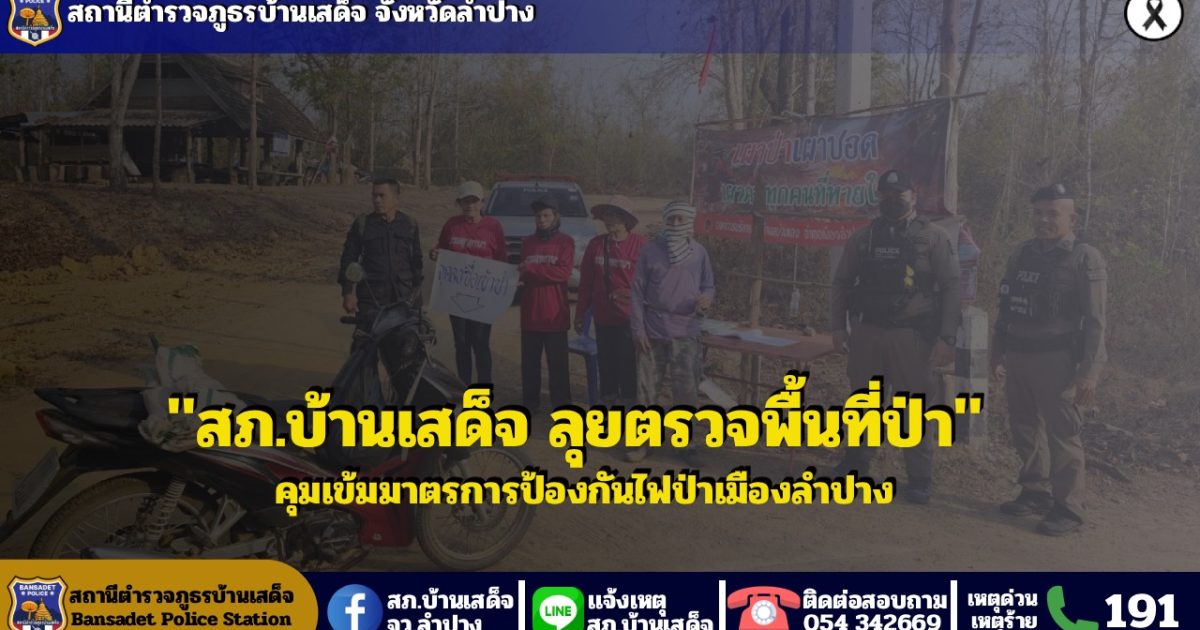 วันที่ 7 มีนาคม 2569 เวลา 08.10 น. ภายใต้การอำนวยการของ พ.ต.อ.ชวลิต จินดารัตน์ ผกก.สภ.บ้านเสด็จ , พ.ต.ท.พงษ์ศิลป์ ธนะภาษี รอง ผกก.ป.ฯ, ว่าที่ พ.ต.ต.นพ พึ่งศรี สวป.ฯ สั่งการให้ ด.ต.ชาติ บุญสมปาน ผบ.หมู่(ป.) สภ.บ้านเสด็จ รักษาการร้อยเวร 20 พร้อมด้วยสายตรวจ 201 , ผู้ใหญ่บ้าน ม.5 ต.บ้านแลงฯ, เจ้าหน้าที่เฝ้าระวังไฟป่า ว.4 ร่วมตั้งจุดคัดกรองบุคคลเข้าใช้พื้นที่ป่า และออกตรวจจุดเฝ้าระวังป้องกันไฟป่า หมู่ 5 บ้านดง ต.บ้านแลง อ.เมืองลำปาง จ.ลำปาง