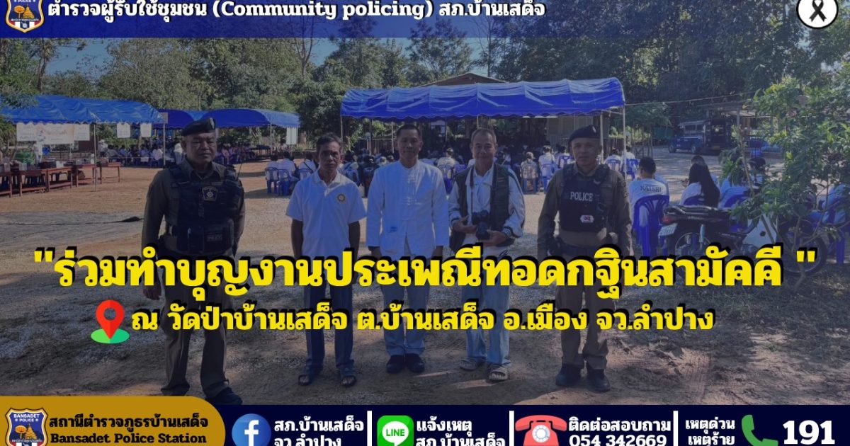 วันที่ 22 พฤศจิกายน 2568 ตั้งแต่เวลา 10.00 น. นำโดย พ.ต.อ.ชวลิต จินดารัตน์ผกก.สภ.บ้านเสด็จ , ร.ต.ท.วิรัช วงค์บุตร รอง สว.(ป.) สภ.บ้านเสด็จ ร้อยเวร 20 พร้อมสายตรวจ 201 ร่วมทำบุญงานประเพณีทอดกฐินสามัคคี ที่วัดป่าบ้านเสด็จ ต.บ้านเสด็จ อ.เมือง จว.ลำปาง และ สอบถามสภาพปัญหาอาชญากรรมและปัญหาต่างๆ ในพื้นที่ เพื่อขอคำแนะนำและช่วยกันแก้ไขปัญหาความเป็นอยู่ของคนในชุมชน