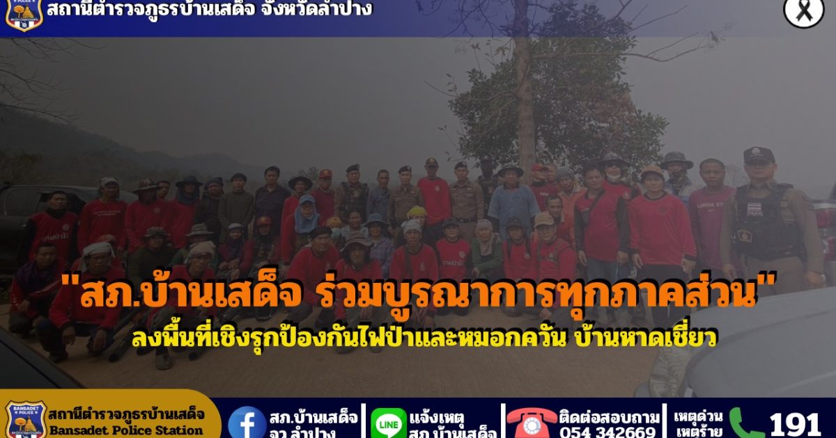 วันที่ 4 มีนาคม 2569 เวลา 14.40 น. พ.ต.อ.ชวลิต จินดารัตน์ ผกก.สภ.บ้านเสด็จ , ว่าที่ พ.ต.ต.นพ พึ่งศรี สวป.ฯ พร้อมสายตรวจ 20/201 ว.4 ร่วมบูรณาการเกี่ยวกับการป้องกันไฟป่าและหมอกควันในพื้นที่ หมู่ 9 บ้านหาดเชี่ยว ต.บ้านแลง ร่วมกับผู้ใหญ่บ้าน,ผู้ช่วยสารวัตรแพทย์ประจำตำบลบ้านแลง พร้อมด้วยอาสาสมัครป้องกันไฟป่าของ 12 หมู่บ้าน (หมู่บ้านละ 3 นาย) และเจ้าหน้าที่อุทยานดอยพระยาแช่,ทีมงานปลัดงานป้องกันของอำเภอเมืองลำปาง