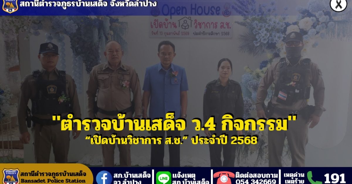 วันที่ 13 กุมภาพันธ์ 2569 เวลา 08.00 น. ภายใต้การอำนวยการของ พ.ต.อ.ชวลิต จินดารัตน์ ผกก.สภ.บ้านเสด็จ สั่งการให้ พ.ต.ท.ธนาศักดิ์ ศรีแปงวงค์ สว.อก. สภ.บ้านเสด็จ พร้อมด้วยสายตรวจ 20/201 ว.4 ร่วมพิธีเปิดและกิจกรรมนิทรรศการ “เปิดบ้านวิชาการ ส.ช.” ประจำปีงบประมาณ 2568 ณ เวทีพัฒนาศักยภาพผู้เรียน อาคารบูรณาการ ICTฯ (โรงเรียนเสด็จวนชยางค์กูลวิทยา)