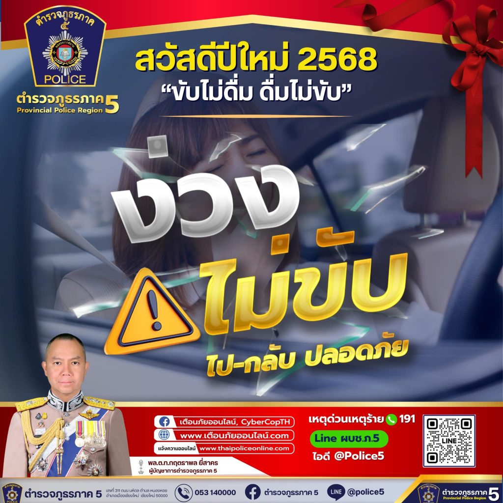 สวัสดีปีใหม่ 2568 “ขับไม่ดื่ม ดื่มไม่ขับ” ตำรวจภูธรภาค 5 26 December 2567 by admin_pimpisa / ข่าวประชาสัมพันธ์