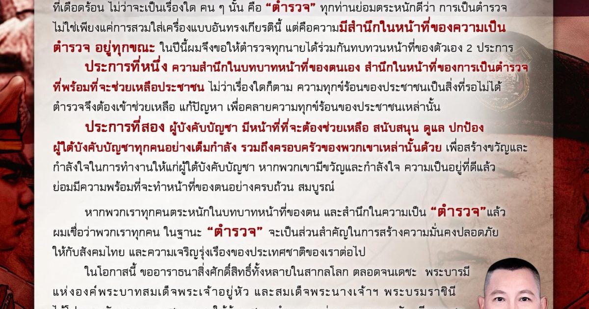 ทุกท่านย่อมตระหนักดีว่า การเป็นตำรวจไม่ใช่เพียงแค่การสวมใส่เครื่องแบบอันทรงเกียรตินี้ แต่คือความมีสำนึกในหน้าที่ของความเป็นตำรวจอยู่ทุกขณะ ในปีนี้ผมจึงขอให้ตำรวจทุกนายได้ร่วมกันทบทวนหน้าที่ของตัวเอง 2 ประการ