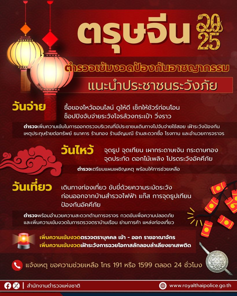 เมื่อวันที่ 26 มกราคม พ.ต.อ.วรศักดิ์ พิสิษฐบรรณกร รองผู้บังคับการสายตรวจและปฏิบัติการพิเศษ รักษาราชการแทนผู้บังคับการกองสารนิเทศ (รอง ผบก.สปพ.รรท.ผบก.สท.) เปิดเผยว่า ช่วงวันที่ 27-29 มกราคม 2568 เป็นเทศกาลตรุษจีนประจำปี 2568 โดยพี่น้องชาวไทยเชื้อสายจีนจะออกมาจับจ่ายซื้อของ เพื่อทำพิธีไหว้บรรพบุรุษ รวมทั้งเดินทางกลับภูมิลำเนาและท่องเที่ยวเฉลิมฉลองเป็นจำนวนมาก ดังนั้น เพื่อให้การป้องกันปราบปรามอาชญากรรม ดูแลความปลอดภัยในชีวิตและทรัพย์สินของประชาชน เป็นไปด้วยความเรียบร้อยและมีประสิทธิภาพตลอดห้วงเทศกาลตรุษจีน ทั้งวันจ่าย วันไหว้ วันเที่ยว สำนักงานตำรวจแห่งชาติ โดย พล.ต.อ.ประจวบ วงศ์สุข รองผู้บัญชาการตำรวจแห่งชาติ จึงกำชับให้หน่วยปฏิบัติดำเนินการตามมาตรการป้องกันปราบปรามอย่างเคร่งครัด