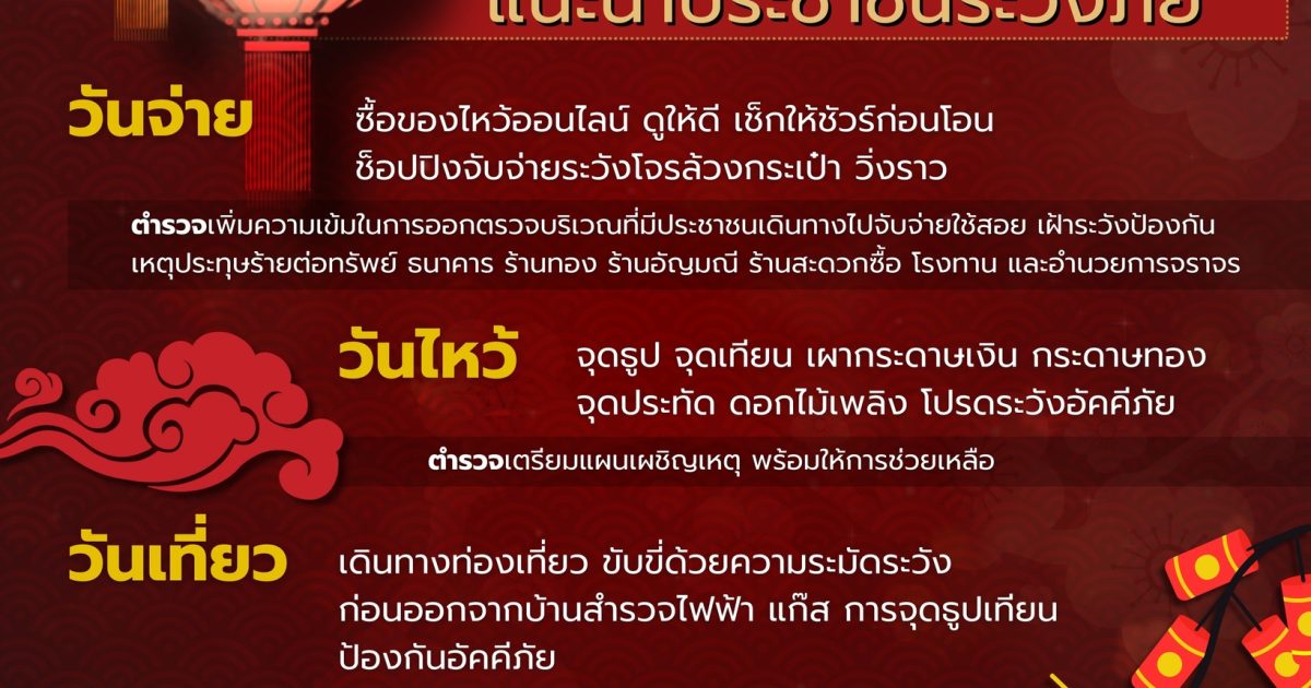 นอกจากนี้ พ.ต.อ.วรศักดิ์ฯ กล่าวว่า ในเทศกาลตรุษจีนนี้ขอให้พี่น้องประชาชนโปรดระมัดระวังป้องกันอัคคีภัยจากการจุดธูปเทียนไว้บรรพบุรุษ ไหว้เจ้า การเผากระดาษเงินกระดาษทองต้องมีภาชนะที่ไม่ติดไฟและแข็งแรงรับรอง ต้องดูให้ไฟดับสนิท การจุดประทัดต้องจุดในที่โล่ง และก่อนออกจากบ้านต้องตรวจสอบปิดสวิตช์เครื่องใช้ไฟฟ้าและถอดปลั๊กออกทุกครั้งเมื่อไม่ได้ใช้งาน รวมทั้งระมัดระวังไม่ตกเป็นเหยื่อของมิจฉาชีพออนไลน์ ที่อาจมาหลอกลวงพี่น้องประชาชนในรูปแบบ “อั่งเปาทิพย์” ส่ง SMS แนบลิงก์เชิญชวนให้รับโชค ซึ่งเป็นลิงก์อันตรายหลอกติดตั้งแอปพลิเคชันดูดเงิน หรือหลอกขอข้อมูลส่วนตัว