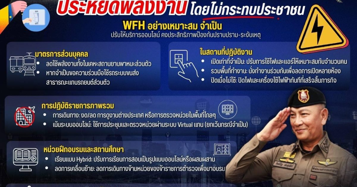 สำนักงานตำรวจแห่งชาติออก 5 มาตรการประหยัดพลังงาน สอดคล้องกับมติที่ประชุมคณะรัฐมนตรี รับมือกับผลกระทบจากสถานการณ์ความไม่สงบในตะวันออกกลาง