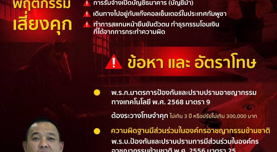 สำนักงานตำรวจแห่งชาติเตือน แก๊ง “ม้าไทย กระโดดข้ามแดน” ระวังจะโดนข้อหาหนัก “มีส่วนร่วมในองค์กรอาชญากรรมข้ามชาติ” โทษจำคุกสูงสุด 15 ปี