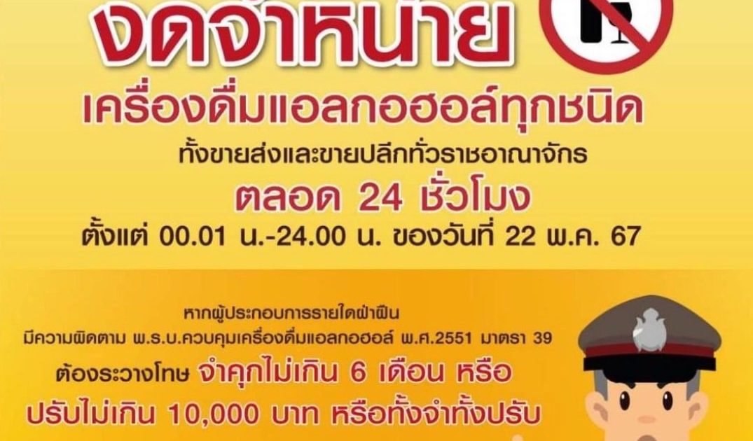 “ได้กำชับให้สถานีตำรวจทุกแห่งประชาสัมพันธ์แจ้งเตือนผู้ประกอบการ ร้านค้าทุกประเภท ทั้งร้านค้าในชุมชน ร้านสะดวกซื้อ ห้างสรรพสินค้า ร้านอาหารที่ขายเครื่องดื่มแอลกอฮอล์ รวมถึงสถานบริการและสถานประกอบการที่เปิดให้บริการลักษณะที่คล้ายสถานบริการ ให้งดขายเครื่องดื่มแอลกอฮอล์ทุกชนิด ทั้งชนิดขายส่งและขายปลีกทั่วราชอาณาจักร ตลอด 24 ชั่วโมง ระหว่างเวลา 00.01 – 24.00 น. ของวันที่ 22 พฤษภาคม 2567 ยกเว้นเฉพาะร้านค้าปลอดอากรภายในอาคารท่าอากาศยานนานาชาติ หากผู้ใดฝ่าฝืน มีความผิดตามพระราชบัญญัติควบคุมเครื่องดื่มแอลกอฮอล์ พ.ศ.2551 มาตรา 39 ต้องระวางโทษจำคุกไม่เกิน 6 เดือน หรือปรับไม่เกิน10,000 บาท หรือทั้งจำทั้งปรับ”