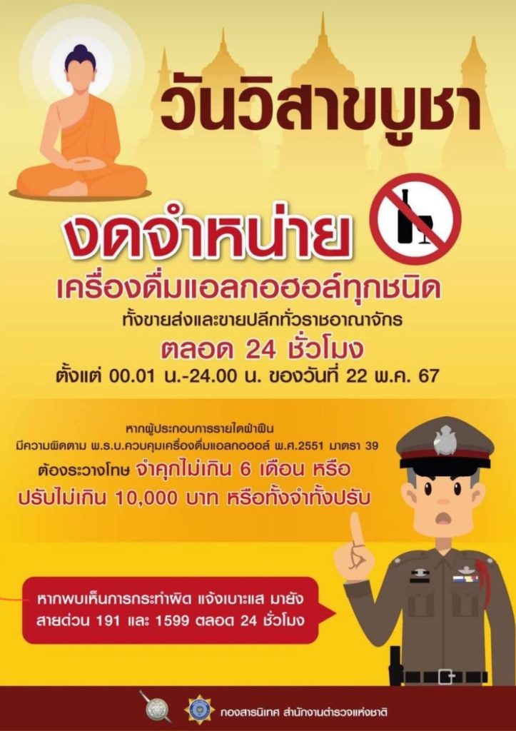 สำนักงานตำรวจแห่งชาติเตือนห้ามขายเครื่องดื่มแอลกอฮอล์ทุกชนิด เนื่องในวันสำคัญทางศาสนา “วันวิสาขบูชา” 22 พฤษภาคมนี้ กำชับตำรวจทั่วประเทศตรวจตราเข้มงวด