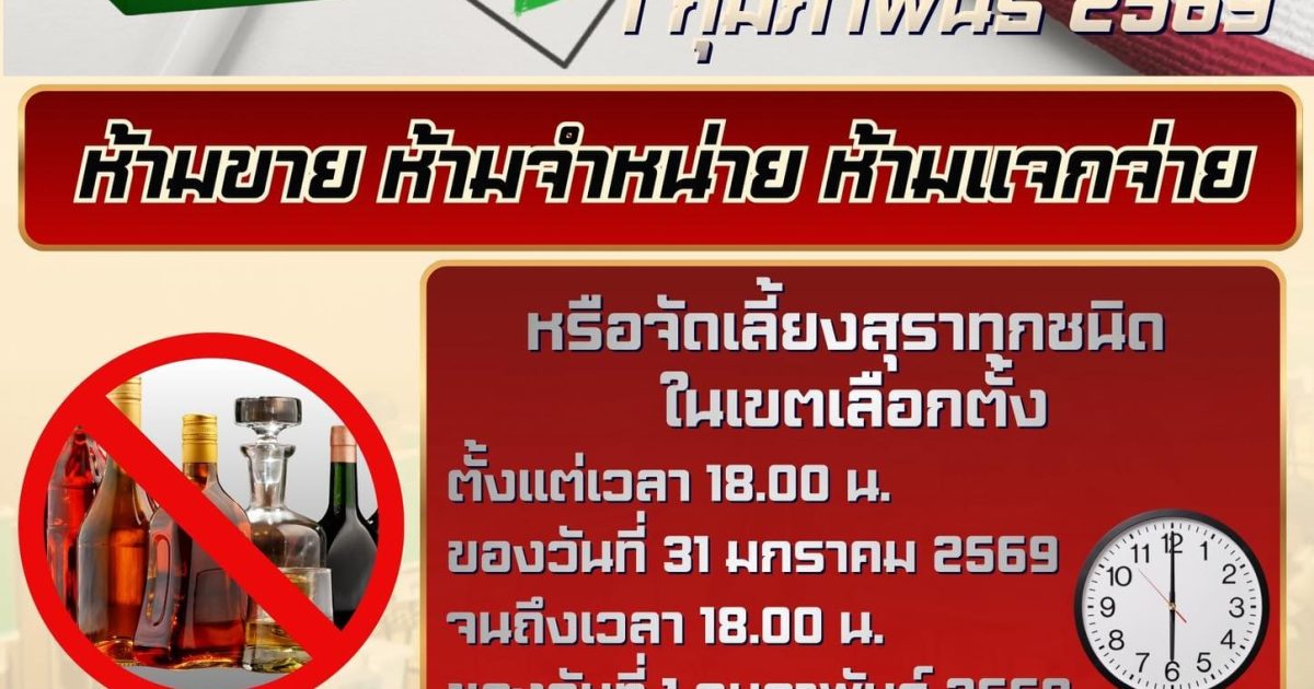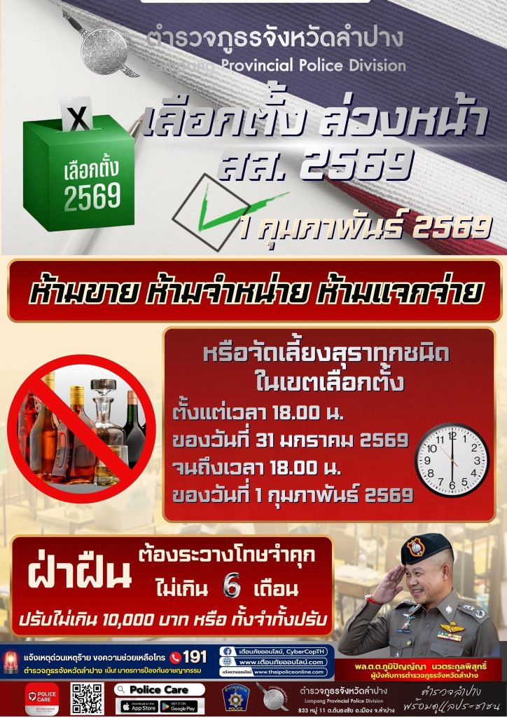 ห้ามขาย ห้ามจำหน่าย ห้ามแจกจ่าย หรือจัดเลี้ยงสุรา เครื่องดื่มแอลกอฮอล์ทุกชนิด ในเขตเลือกตั้ง 29 January 2569 by admin_pimpisa / ข่าวประชาสัมพันธ์ ตำรวจภูธรจังหวัดลำปาง เลือกตั้งล่วงหน้า สส.2569 วันที่ 1 กุมภาพันธ์ 2569 ห้ามขาย ห้ามจำหน่าย ห้ามแจกจ่าย หรือจัดเลี้ยงสุรา เครื่องดื่มแอลกอฮอล์ทุกชนิด ในเขตเลือกตั้ง ตั้งแต่เวลา 18.00 น. ของวันที่ 31 มกราคม 2569 ถึงเวลา 18.00 น. ของวันที่ 1 กุมภาพันธ์ 2569 ฝ่าฝืน ต้องระวางโทษจำคุกไม่เกิน 6 เดือน ปรับไม่เกิน 10,000 บาท หรือ ทั้งจำทั้งปรับ ด้วยความห่วงใย จาก พล.ต.ต.ภูมิปัญญ์ญา นวตระกูลพิสุทธิ์ ผู้บังคับการตำรวจภูธรจังหวัดลำปาง