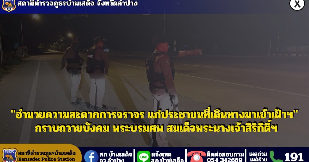 วันที่ 14 ธันวาคม 2568 ตั้งแต่เวลา 18.30 น. โดยการอำนวยการสั่งการของ พ.ต.อ.ชวลิต จินดารัตน์ ผกก.สภ.บ้านเสด็จ , พ.ต.ท. พงษ์ศิลป์ ธนะภาษี รองผกก.ป.ฯ,ว่าที่ พ.ต.ต.นพ พึ่งศรี สวป.ฯ มอบหมายให้ ร.ต.ท.วิรัช วงค์บุตร รอง สว.(ป.) สภ.บ้านเสด็จ ร้อยเวร 20 พร้อมสายตรวจ 201 ว.4 อำนวยความสะดวกการจราจร แก่ประชาชนที่เดินทางมาเข้าเฝ้าฯกราบถวายบังคม พระบรมศพ สมเด็จพระนางเจ้าสิริกิติ์ฯ ที่บริเวณแยกไฟแดงปากทางเขื่อนกิ่วลม ม.16 ต.บ้านเสด็จ อ.เมือง จ.ลำปาง