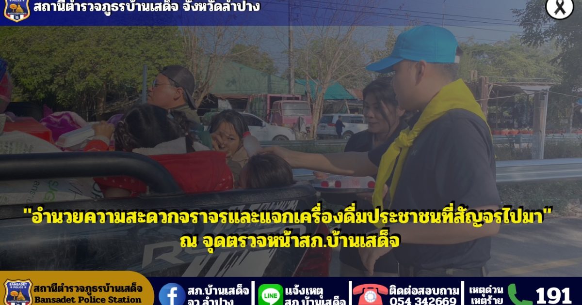 วันนี้ 4 ม.ค.69 นำโดย พ.ต.อ.ชวลิต จินดารัตน์ ผกก.สภ.บ้านเสด็จ พร้อมเจ้าหน้าที่ตำรวจ สภ.บ้านเสด็จ,เจ้าหน้าที่ฝ่ายปกครอง ,อาสาสมัครตำรวจ ,ชุดจิตอาสา สภ.บ้านเสด็จ ได้ร่วมกัน ว.4 ว.43 อำนวยความสะดวกจราจรและแจกเครื่องดื่มประชาชนที่สัญจรไปมา ณ จุดตรวจหน้าสภ.บ้านเสด็จ