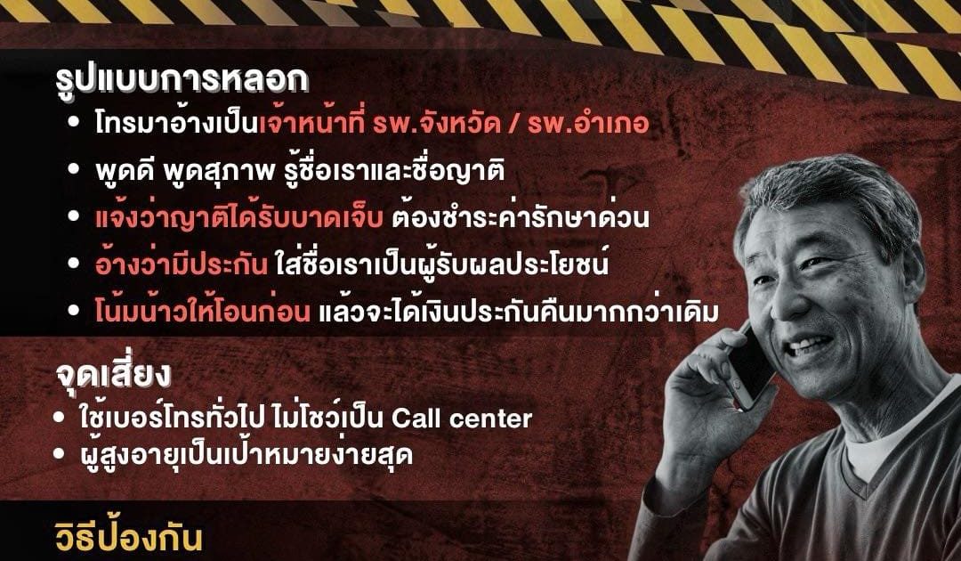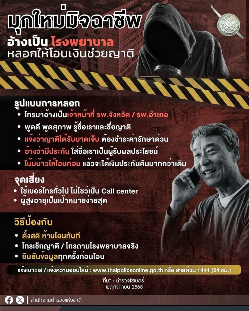 มุกใหม่มิจฉาชีพ อ้างเป็นโรงพยาบาล หลอกว่าญาติป่วย โน้มน้าวเร่งให้โอนเงิน![]()