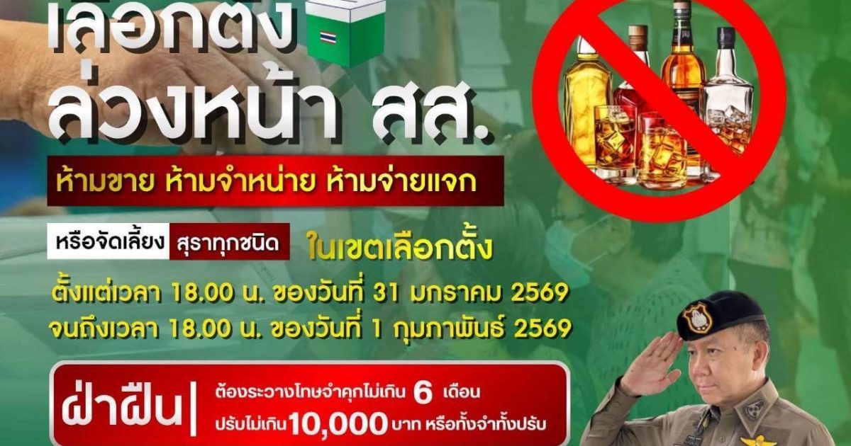 เลือกตั้ง ล่วงหน้า สส. ห้ามขาย ห้ามจำหน่าย ห้ามแจกจ่ายหรือจัดเลี้ยง สุราทุกชนิด ในเขตเลือกตั้ง