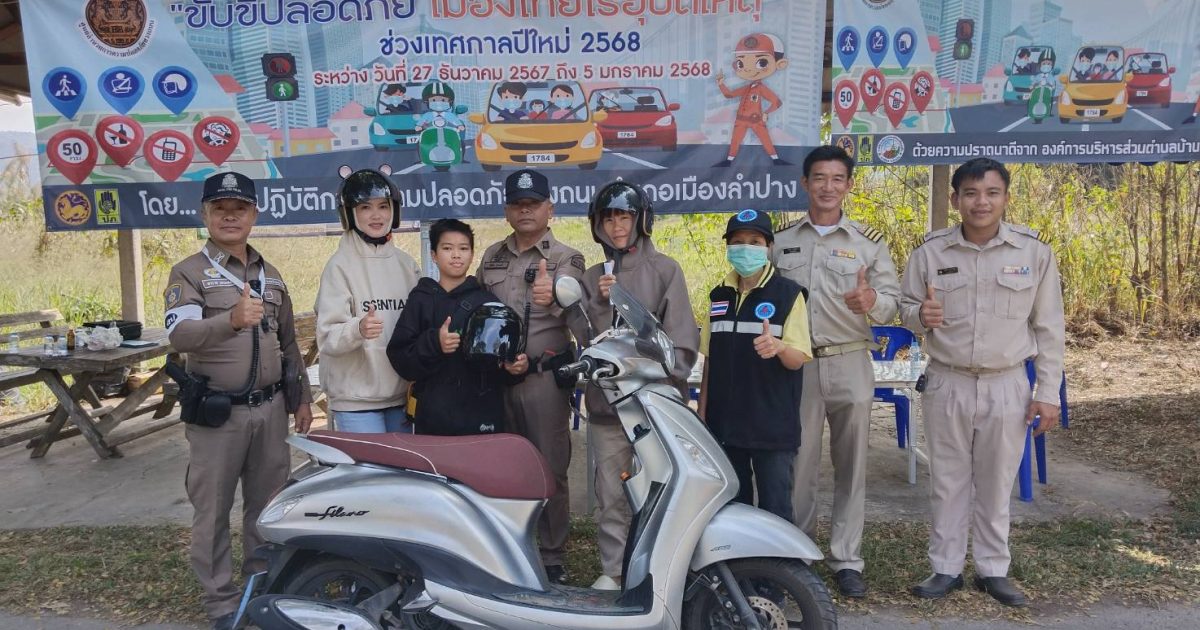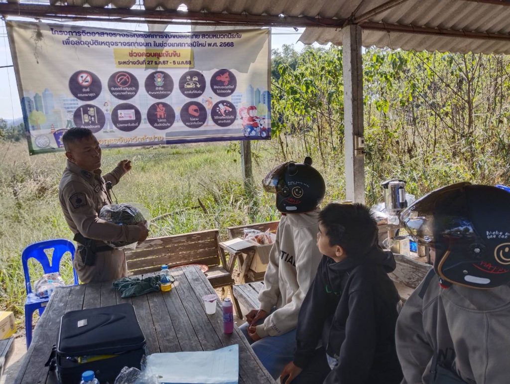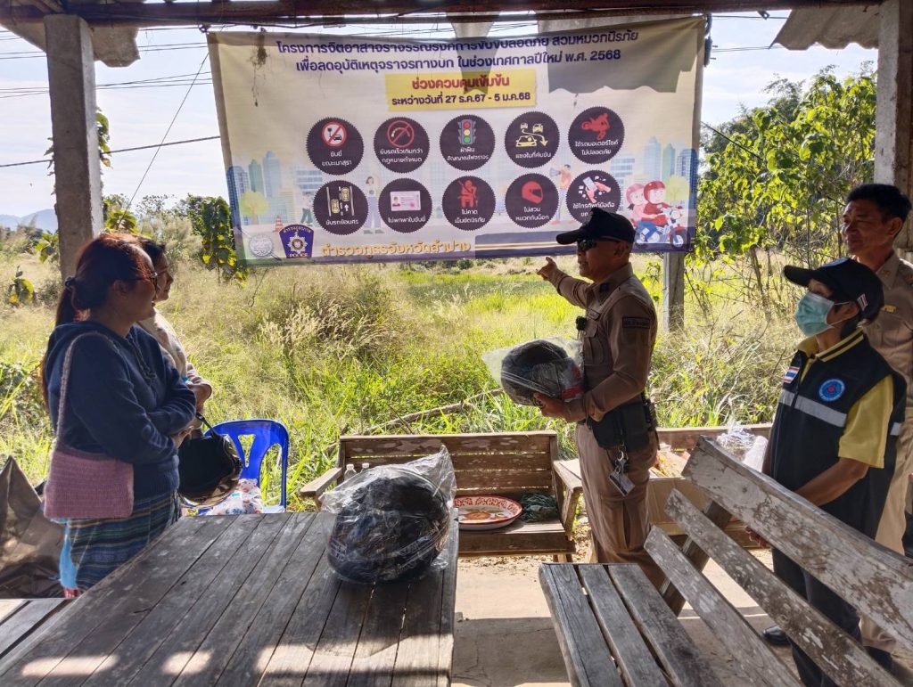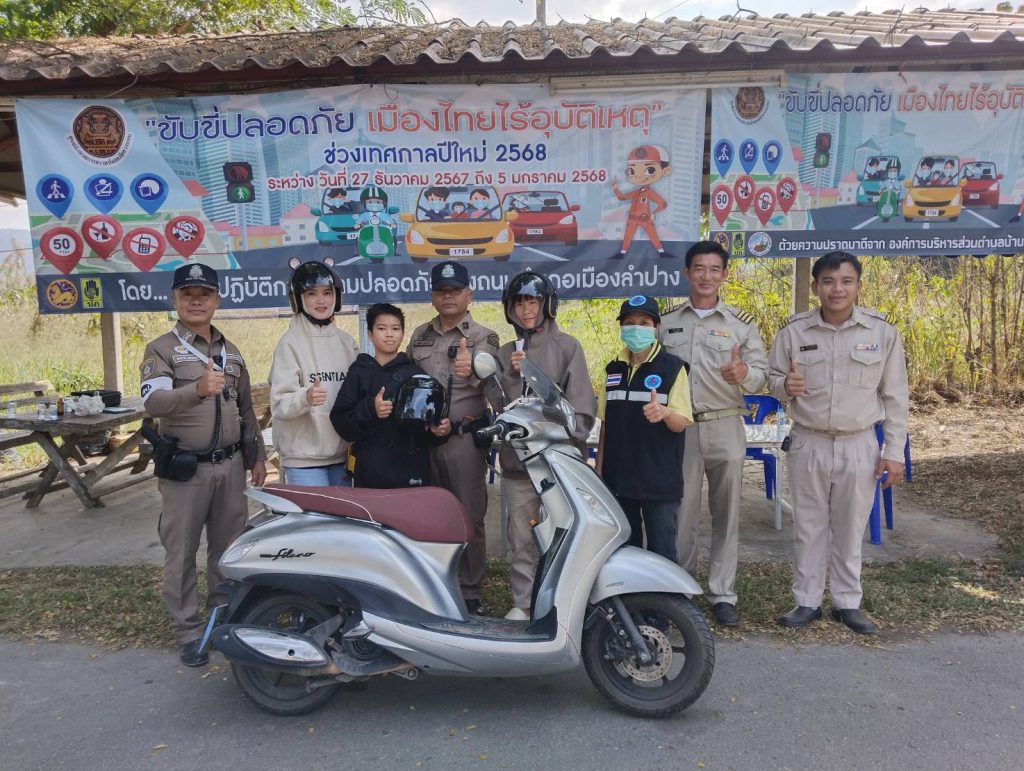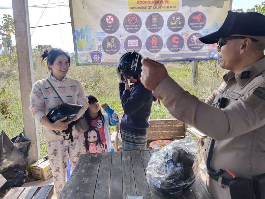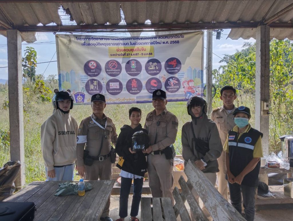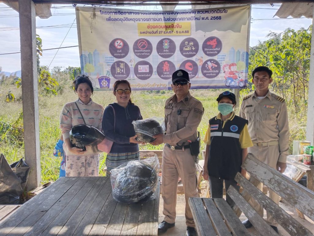 วันที่ 1 มกราคม 2568 เวลา 10.00 น. โดยการอำนวยการของ พ.ต.อ.ชวลิต จินดารัตน์ ผกก.สภ.บ้านเสด็จ ,พ.ต.ท.พงษ์ศิลป์ ธนะภาษี รอง ผกก.ป.สภ.บ้านเสด็จ มอบหมายให้ พ.ต.ท.โสกิจ วรวงศ์ สวป.สภ.บ้านเสด็จ พร้อมด้วยข้าราชการตำรวจ สภ.บ้านเสด็จ ร่วมกันแจกหมวกนิรภัยซึ่งได้รับมาจากสำนักงานตำรวจแห่งชาติให้แก่ประชาชนตามโครงการจิตอาสาจราจร รณรงค์การขับขี่ปลอดภัย สวมหมวกนิรภัย เพื่อลดอุบัติเหตุจราจรทางบกในช่วงเทศกาลปีใหม่ พ.ศ.2568 ตำรวจภูธรจังหวัดลำปาง ณ จุดตรวจร่วมหน้า สภ.บ้านเสด็จ