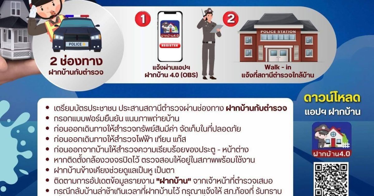 ผ่านทางแอปฯ “ฝากบ้าน 4.0 (OBS)” และ Walk – in สถานีตำรวจใกล้บ้านท่าน