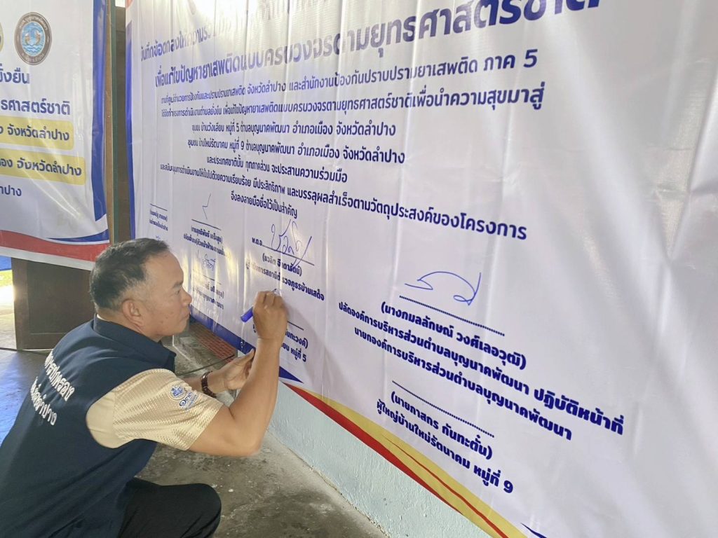 วันนี้ 9 ก.พ.2569 เวลา 09.00 น. พ.ต.อ.ชวลิต จินดารัตน์ ผกก.สภ.บ้านเสด็จ, พ.ต.ท.พงษ์ศิลป์ ธนะภาษี รอง ผกก.ป.ฯ,พ.ต.ต.นพ พึ่งศรี สวป.ฯ,พร้อมด้วยเจ้าหน้าที่ตำรวจชุดปฏิบัติการโครงการดำเนินงานตำบลยั่งยืน ร่วมกับอำเภอเมืองลำปาง,อบต.บุญนาคพัฒนา,รพ.สต.บ้านนิคม เขต 16, กำนันตำบลบุญนาคพัฒนา,ผู้ใหญ่บ้าน ม.5 และ ม.9 ต.บุญนาคพัฒนา อ.เมือง จ.ลำปาง, คณะกรรมการหมู่บ้าน, อสม., ภาคีเครือข่าย ทำการเปิดโครงการดำเนินงานตำบลยั่งยืน เพื่อแก้ไขปัญหายาเสพติดแบบครบวงจรตามยุทธศาสตร์ชาติ ณ ศาลาอเนกประสงค์บ้านวังเลียบ ม.5 ต.บุญนาคพัฒนา อ.เมือง จว.ลำปาง โดยมี นายสุทธิพันธ์ เครือสุข ปลัดอำเภอเมืองลำปาง เป็นประธานในพิธีเปิดโครงการฯ ซึ่งทุกฝ่ายให้ได้เห็นพ้องกันว่าปัญหายาเสพติดเป็นปัญหาสำคัญเร่งด่วนที่จะต้องได้รับการแก้ไขโดยมีการบูรณาการร่วมกัน เพื่อแก้ไขปัญหาดังกล่าวอย่างครบวงจร จึงได้ร่วมลงนาม MOU ไว้เป็นสำคัญ